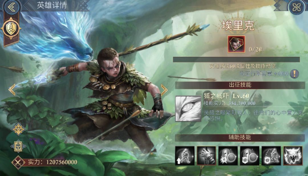 埃里克可使己方最高等级的步兵队列对随机目标发动“狐之威吓”,大幅降低敌方攻击力,从而降低己方队伍的承伤压力(因为是随机目标,可影响到敌方后排负责输出的弓兵)。在激活溅血狐爪后释放狐之威吓可额外对敌方造成额外伤害,作为步兵队列也能打到敌方后排。