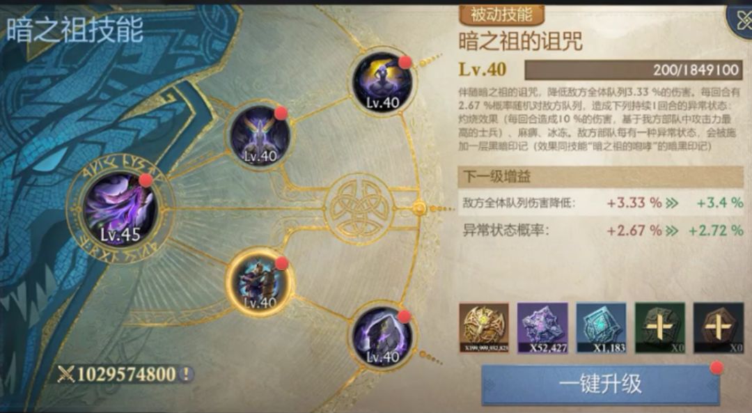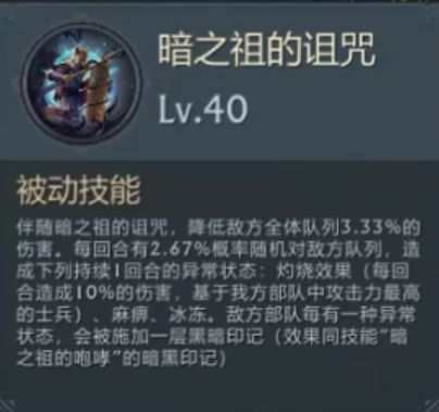 除了主动咆哮外,暗之祖的诅咒可降低敌方全体队列伤害,并小概率对随机队列附带各类异常状态,可提升黑暗印记的施加效率。