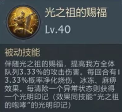 赐福可提升我方全体队列的攻击,并有概率净化异常,可有效应对暗之祖的诅咒。