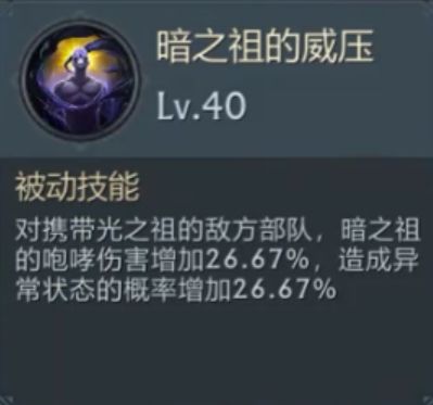 威压类被动光暗巨龙属于相互克制,对携带光之祖的敌方部队可额外提升咆哮伤害、异常状态附加概率(但会被光之祖净化,提供额外的光明印记)。光、暗始祖巨龙谁的技能等级高,对彼此克制就强一些。