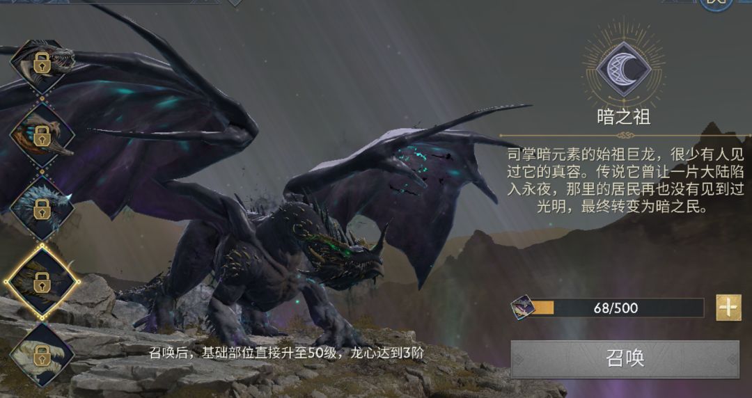 可消耗先祖追忆道具对巨龙的各个技能进行升级,升级后可提升技能效果。暗之龙可提供全面的控场、增伤效果,养成优先级高于其他巨龙。