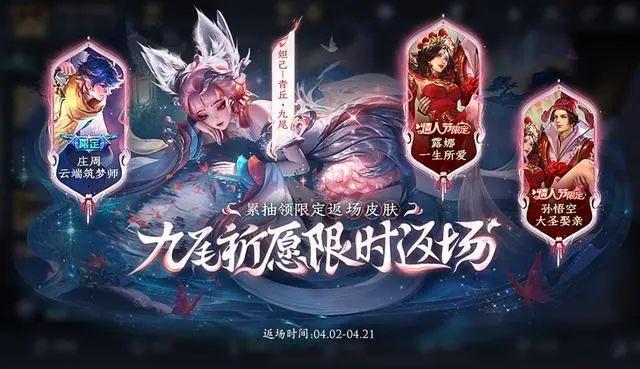 其中,妲己九尾新增了局内出场表演(骑着灵狐),差不多10秒左右,同时还新增了推塔铭刻、血条消散以及闪光海报这几个无双皮肤该有的福利。另外呢,重新优化的妲己九尾狐,在局内的一技能,是分为普通版和九尾虚影两种不同的特效哦。这也难怪,王者荣耀会先返场妲己九尾皮肤,而不返场武则天的明辉仪。同时,这次伴随妲己九尾一起返场的,还有庄周、猴子露娜三款限定皮肤哦,保底依旧是4000点券哈。