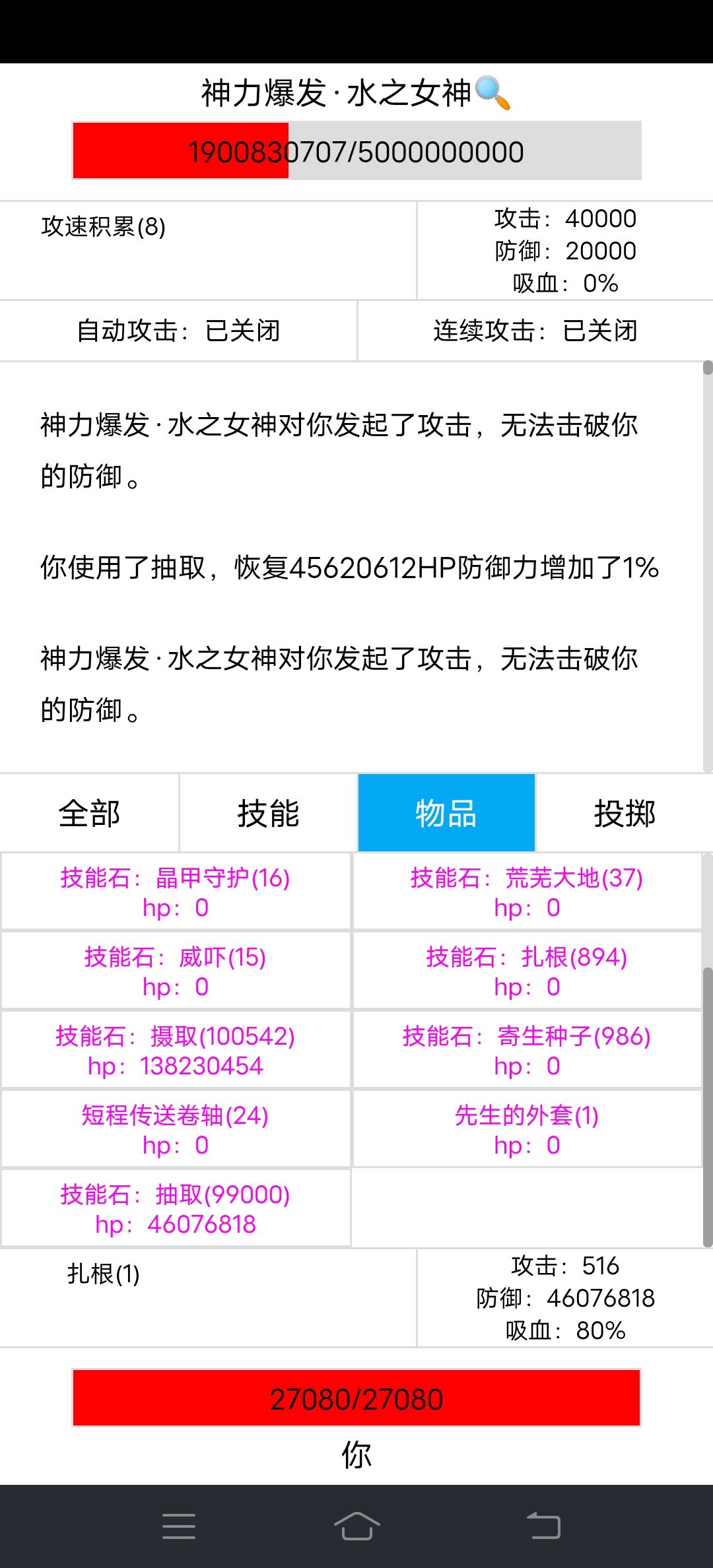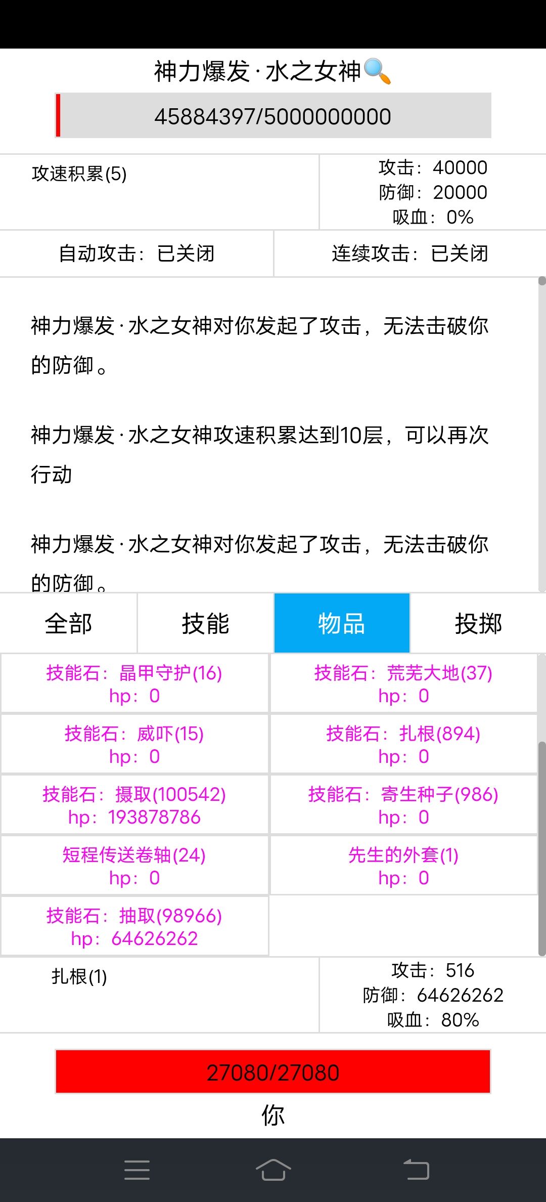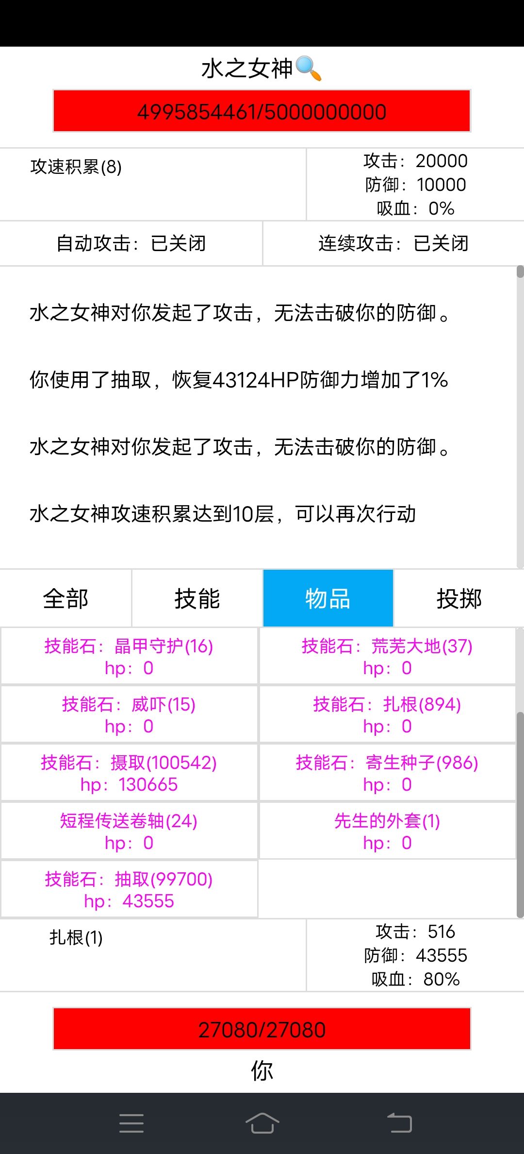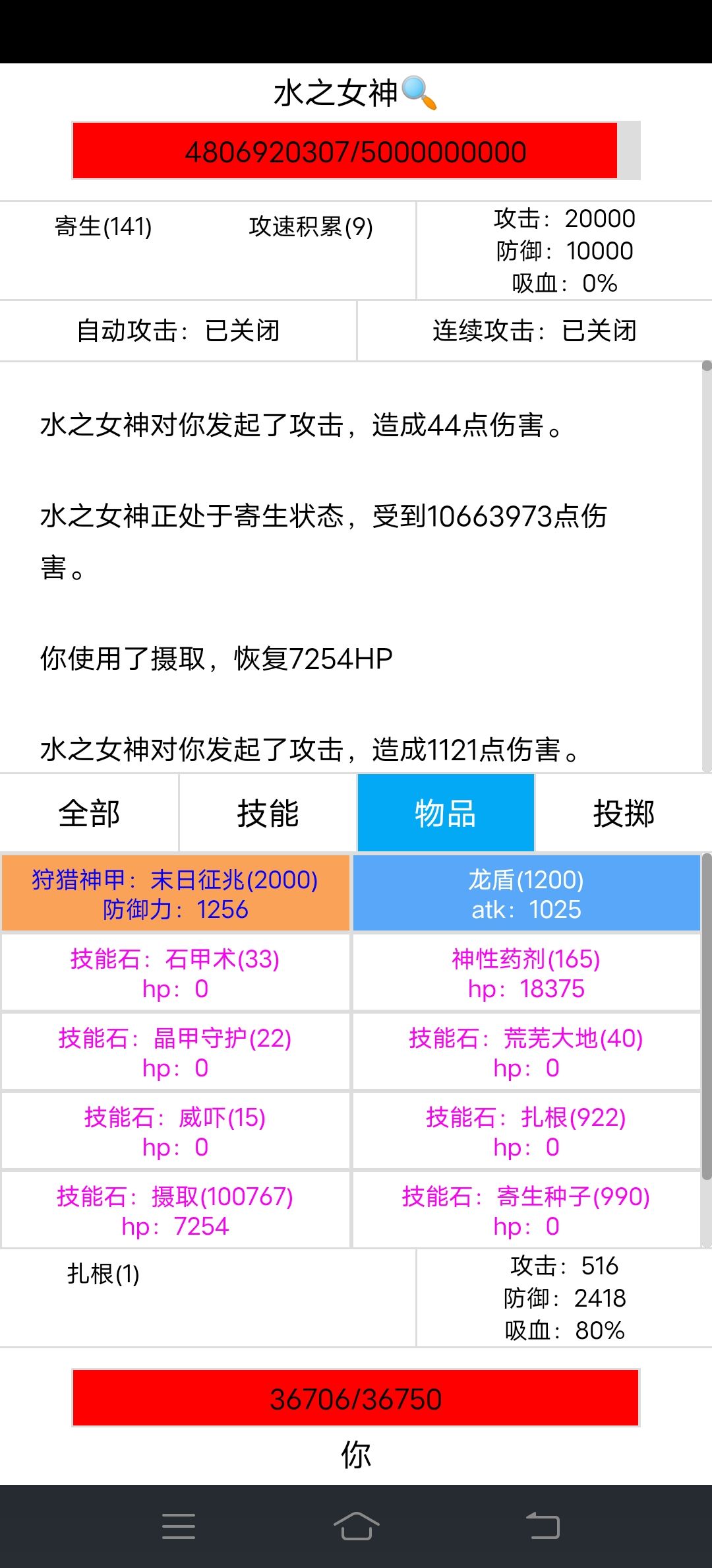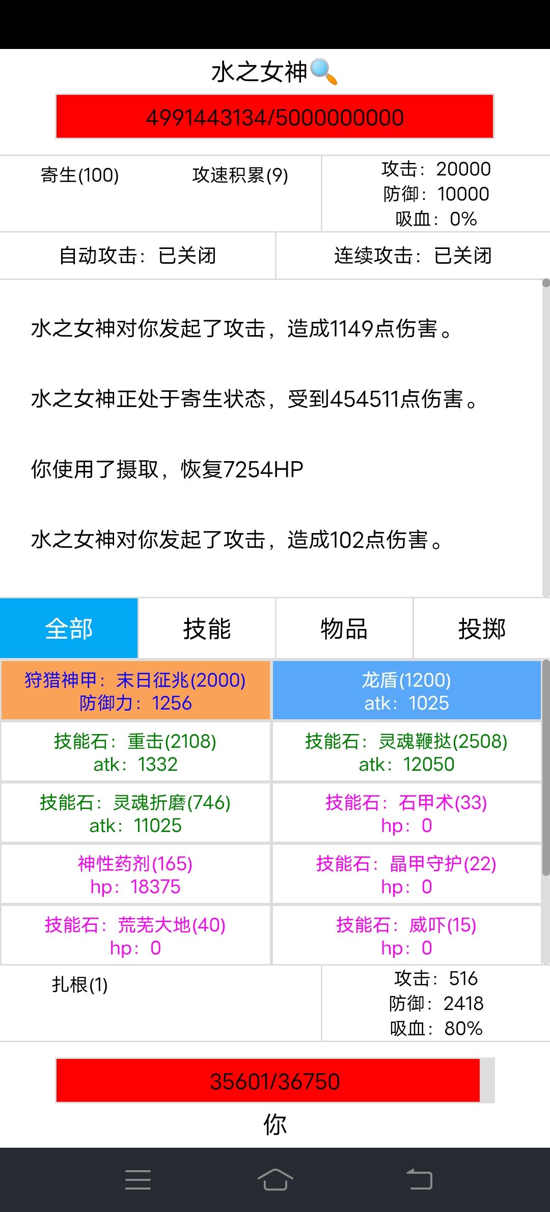 5、战斗很简单,没什么操作性,不用挂机手点很快就点死了。使用晶甲守护,总85%的减伤,水之女神打的血3000左右波动,完全能承受的住