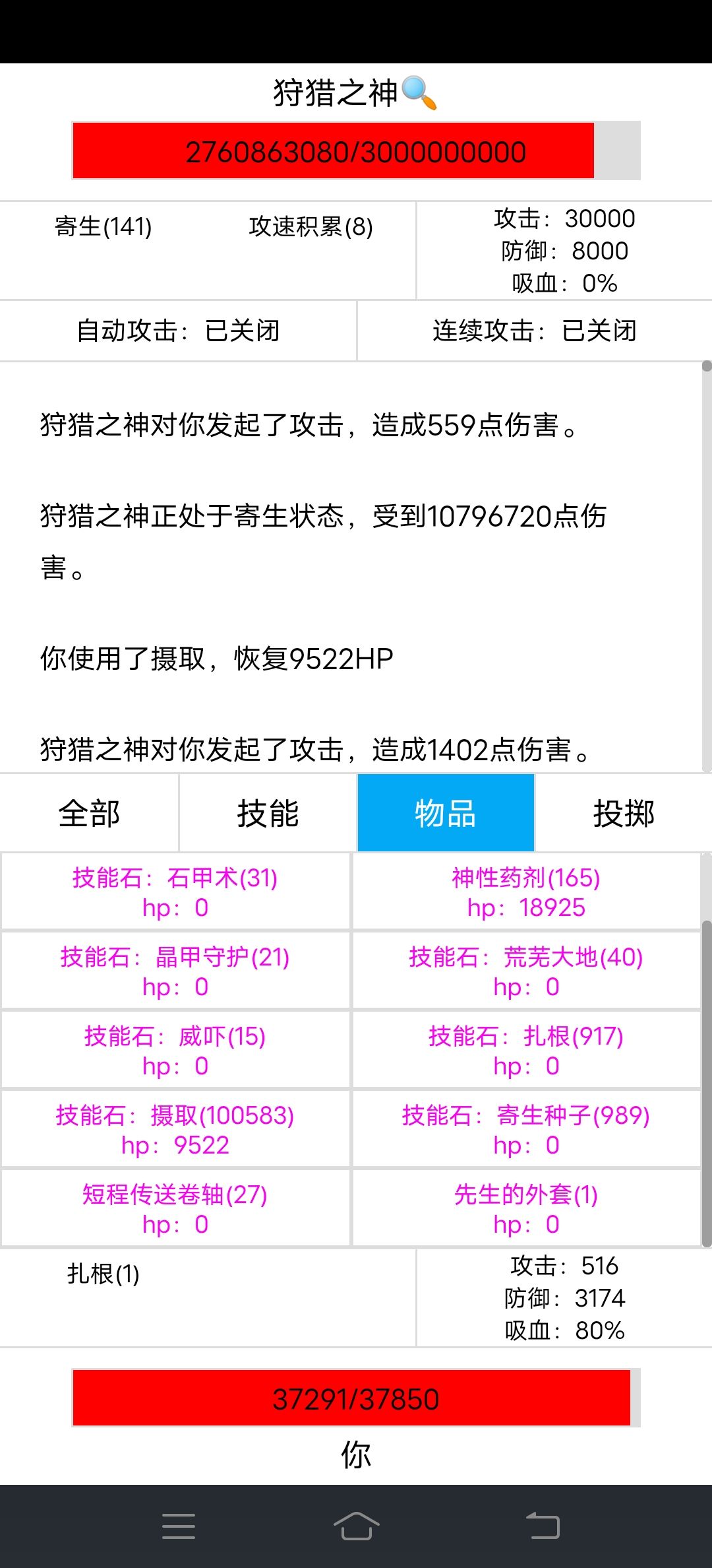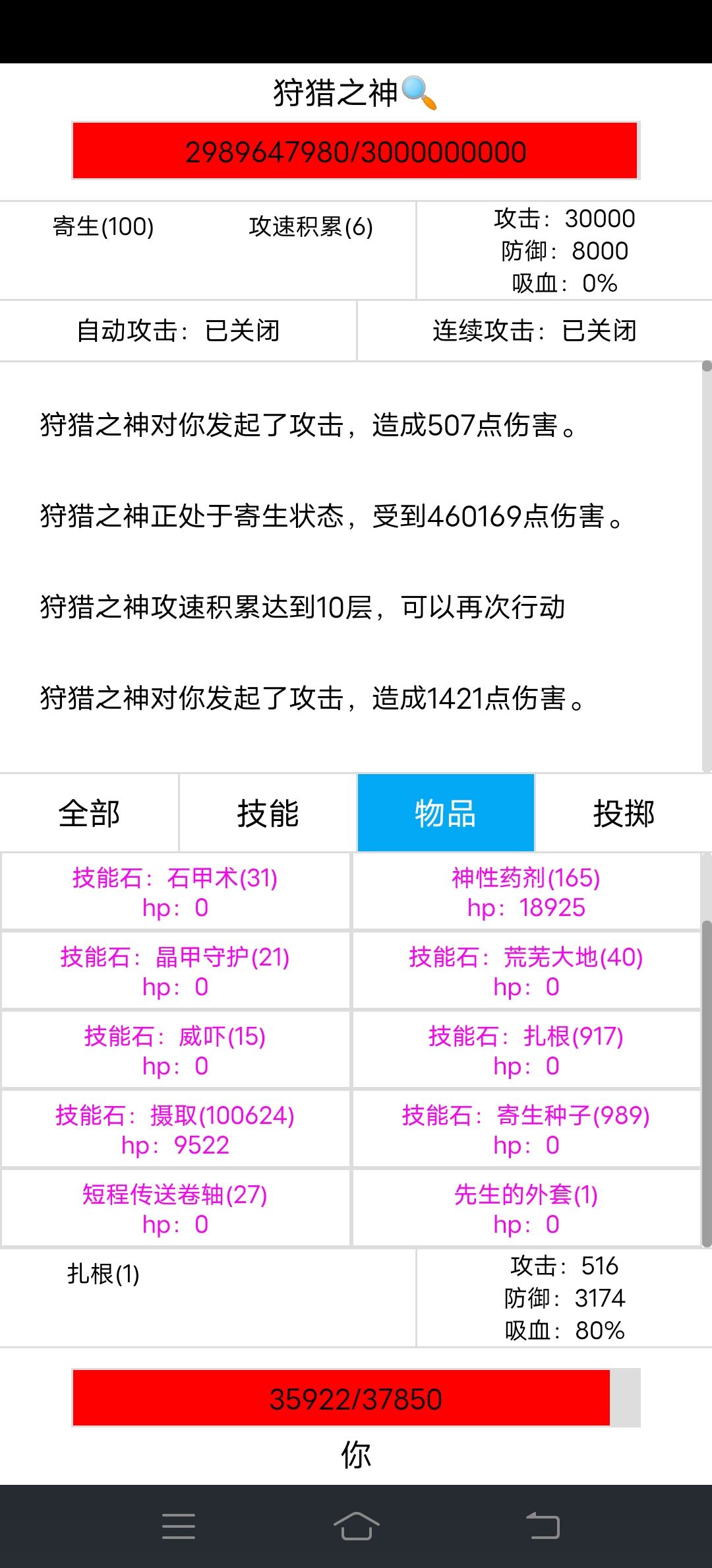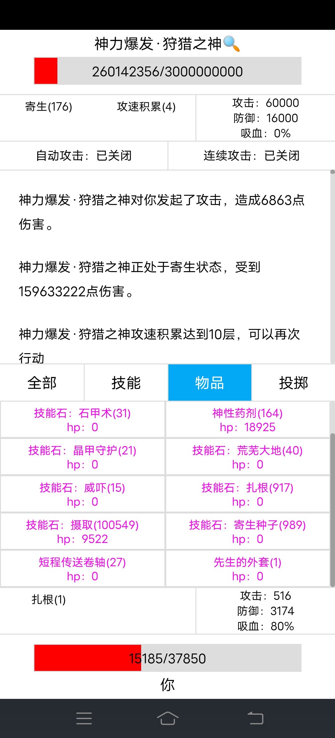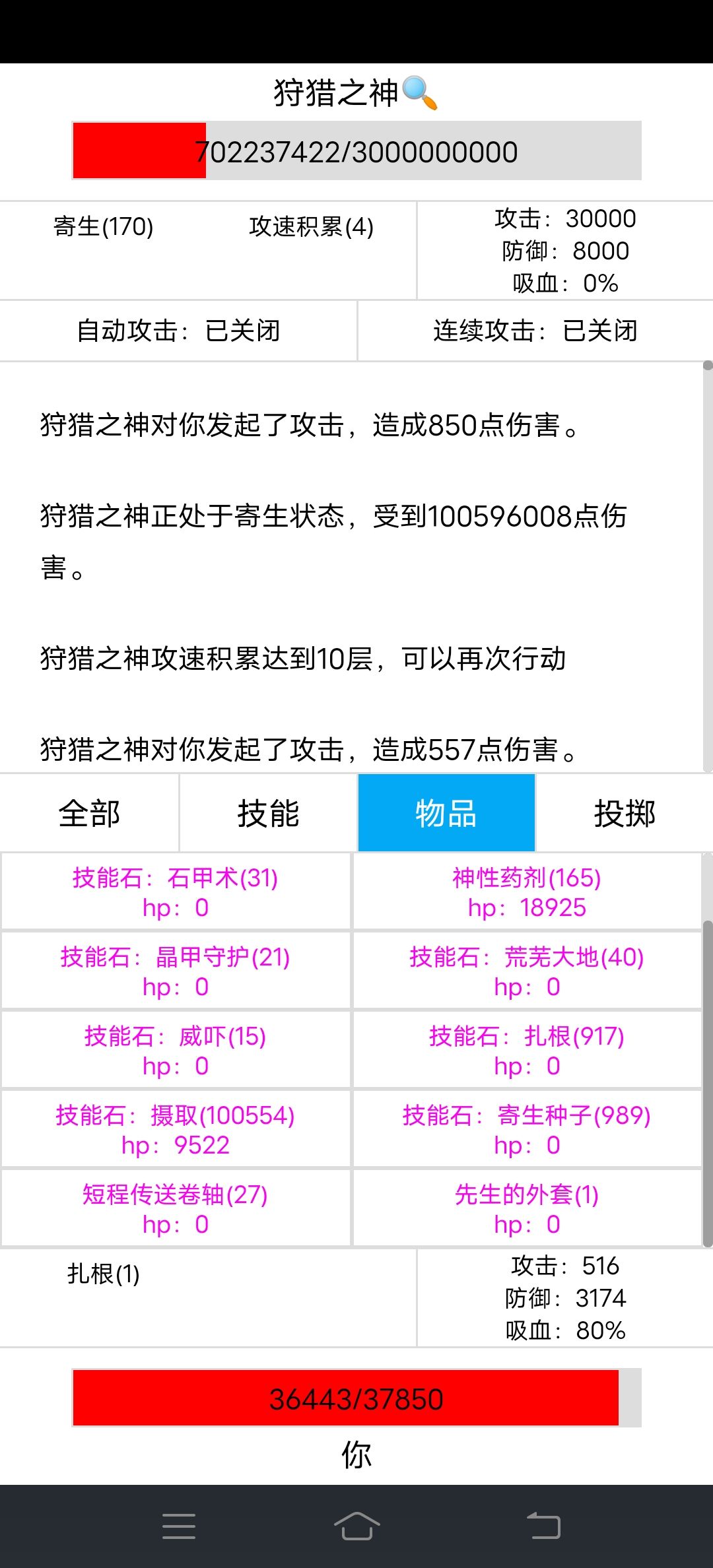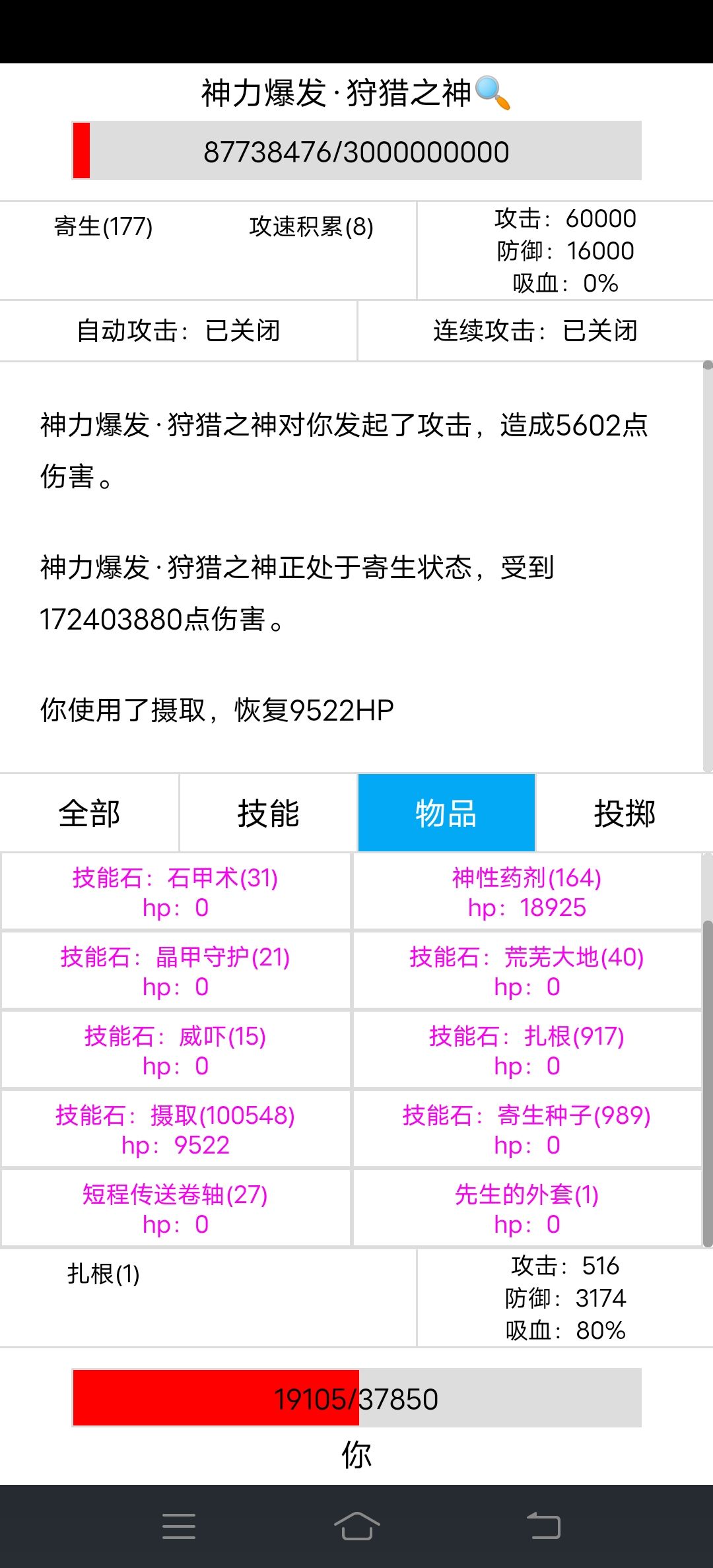 寄生170层伤害1个亿,达到亿级伤害,狩猎之神很快就撑不住了,不过狩猎之神伤害高,我的减伤才85%,我也快撑不住了,我有先生的外套做后手,先坚持不用,看谁先撑不住。