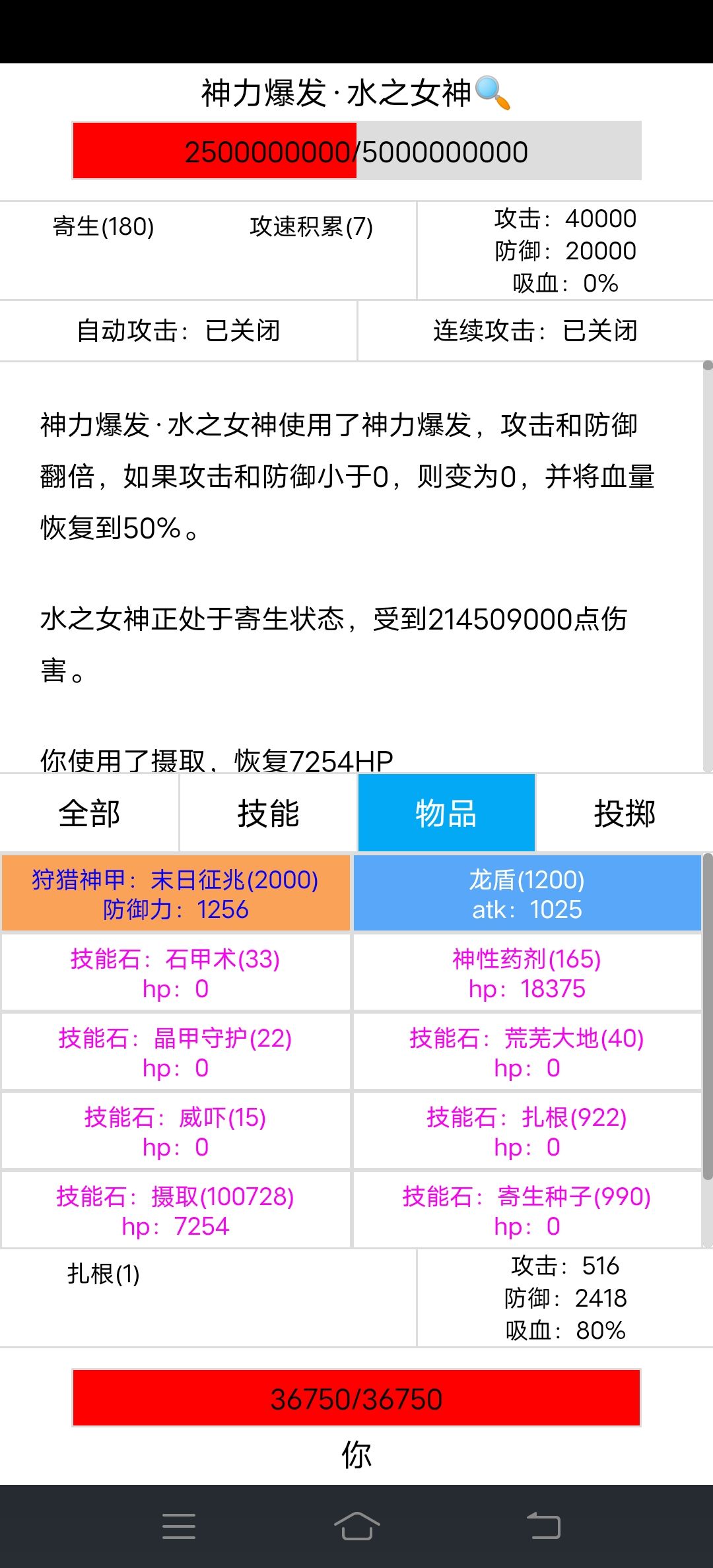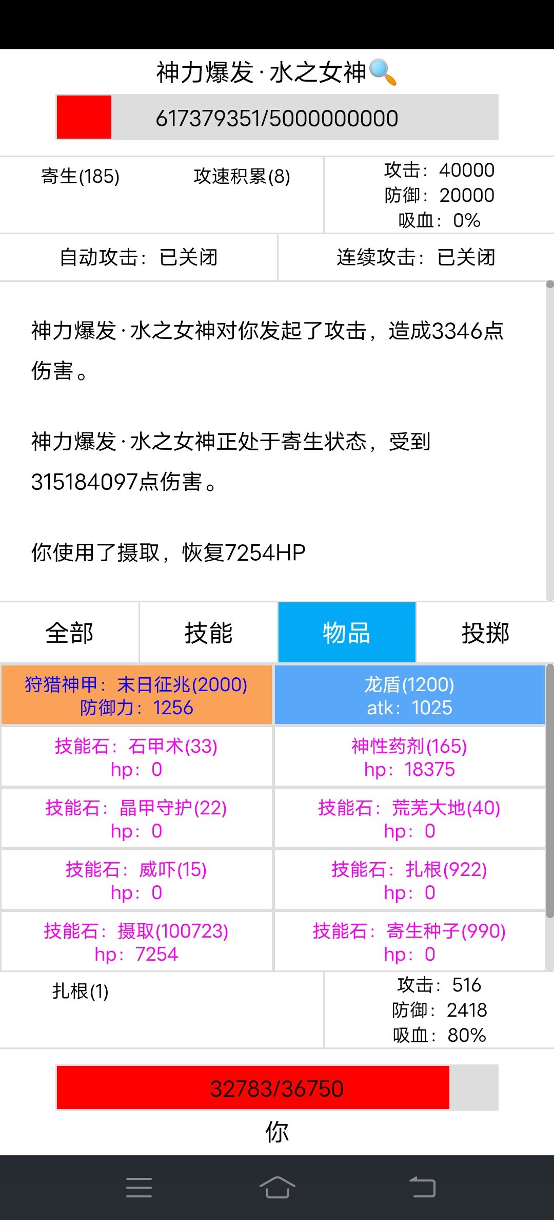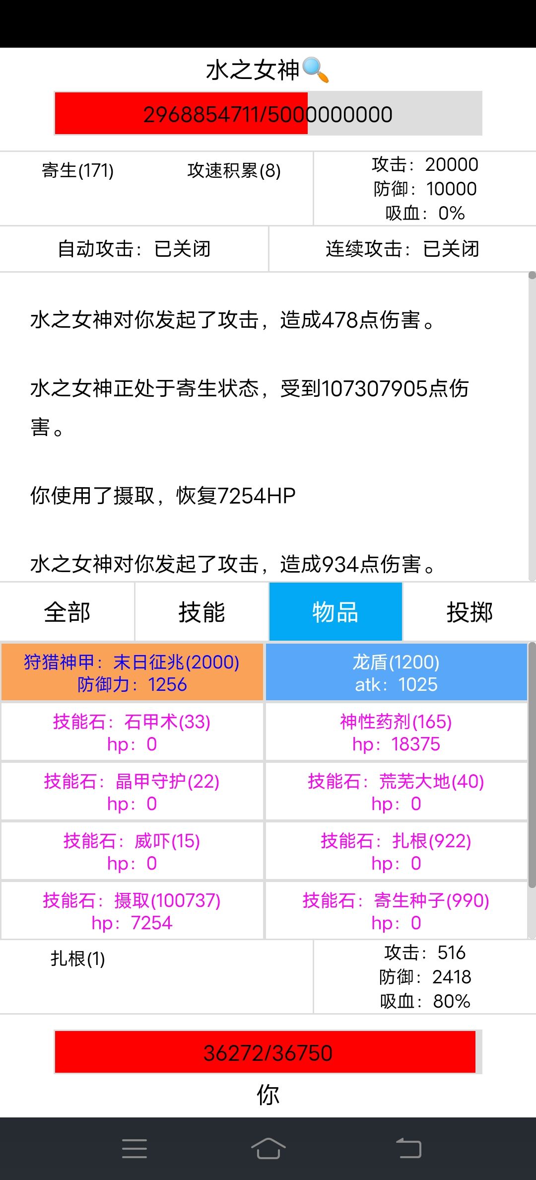 寄生170层,伤害达到1个亿,往后注意水之女神血量,低于20%会使用技能,伤害会翻倍攻击达到40000,血量回到50%,