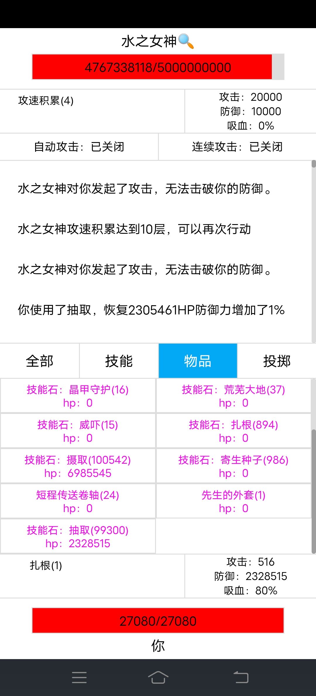 水之女神20000攻击力看着吓人,完全能抗住,20000*0.45=9000,9000-2248*1.3(石甲术)=6077.6的伤害,回血能回上来,越叠加技能抽取防御就越高,受伤害越低。