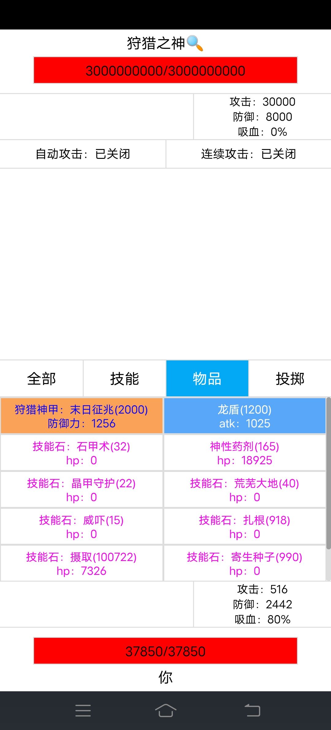 3、狩猎之神攻击30000,使用技能后会翻倍达到60000,后面注意。