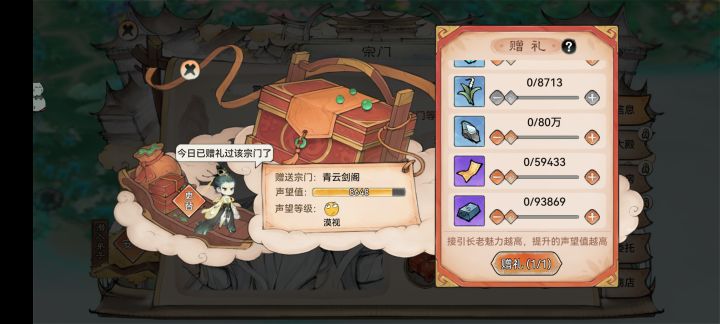 1.送礼:通过赠送符纸和玄铁等礼物,可以有效提升宗门对玩家的好感度。虽然这会消耗玩家的资源,但效果显著。