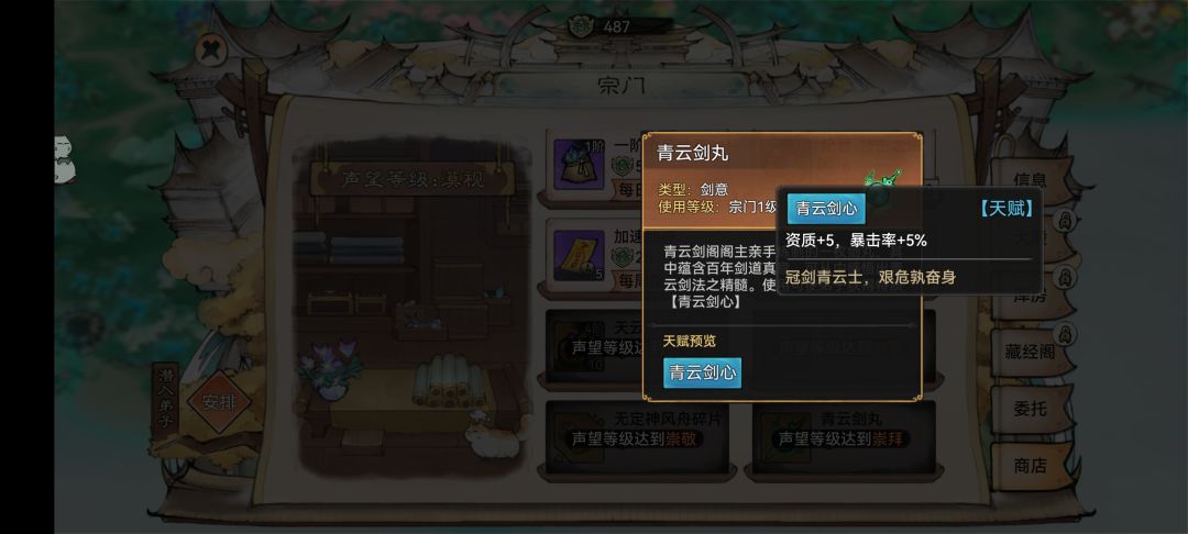 青云剑阁:推荐增加青云剑阁好感度,因为它提供了强力的木系功法《青云剑典》。此外,搭配三阶法宝物伤木竹子和灵根变异,玩家可以获得额外的青云剑丸,进一步提升天赋。(如同五、六)