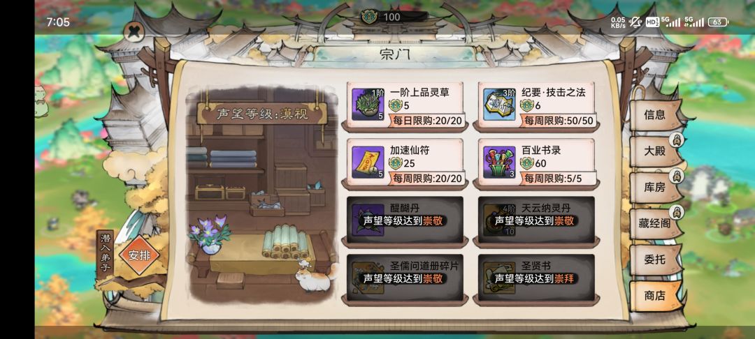 宗门商店提供了各种道具和资源,玩家可以通过完成委托任务获得货币来购买。随着宗门好感度的提升,玩家可以解锁更多高级别的商品。(如图三、四)
