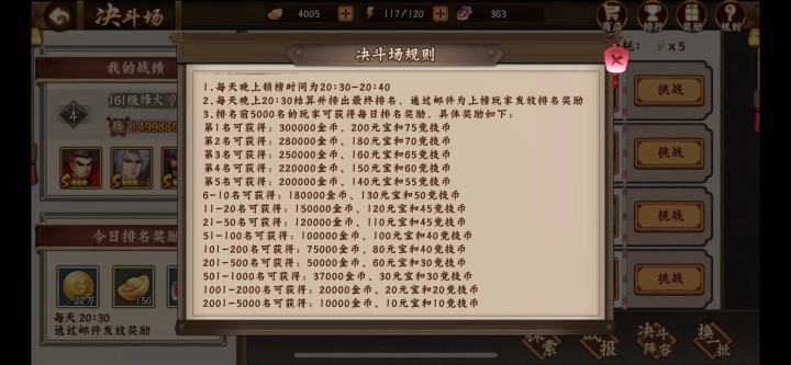 继续说元宝获取和囤积。决斗场是一个每天必打(或扫荡)的获取元宝的途径。决斗场即使是手动挑战,5局需要花费的时间也很少,如果是扫荡更是秒扫。我建议战力争取保持在全区前50名以内,这样决斗场一般都能打进前50名。以21-50名的结算为例,每天可获110元宝,每个月就是大约3300元宝,也是一笔不小的收入。