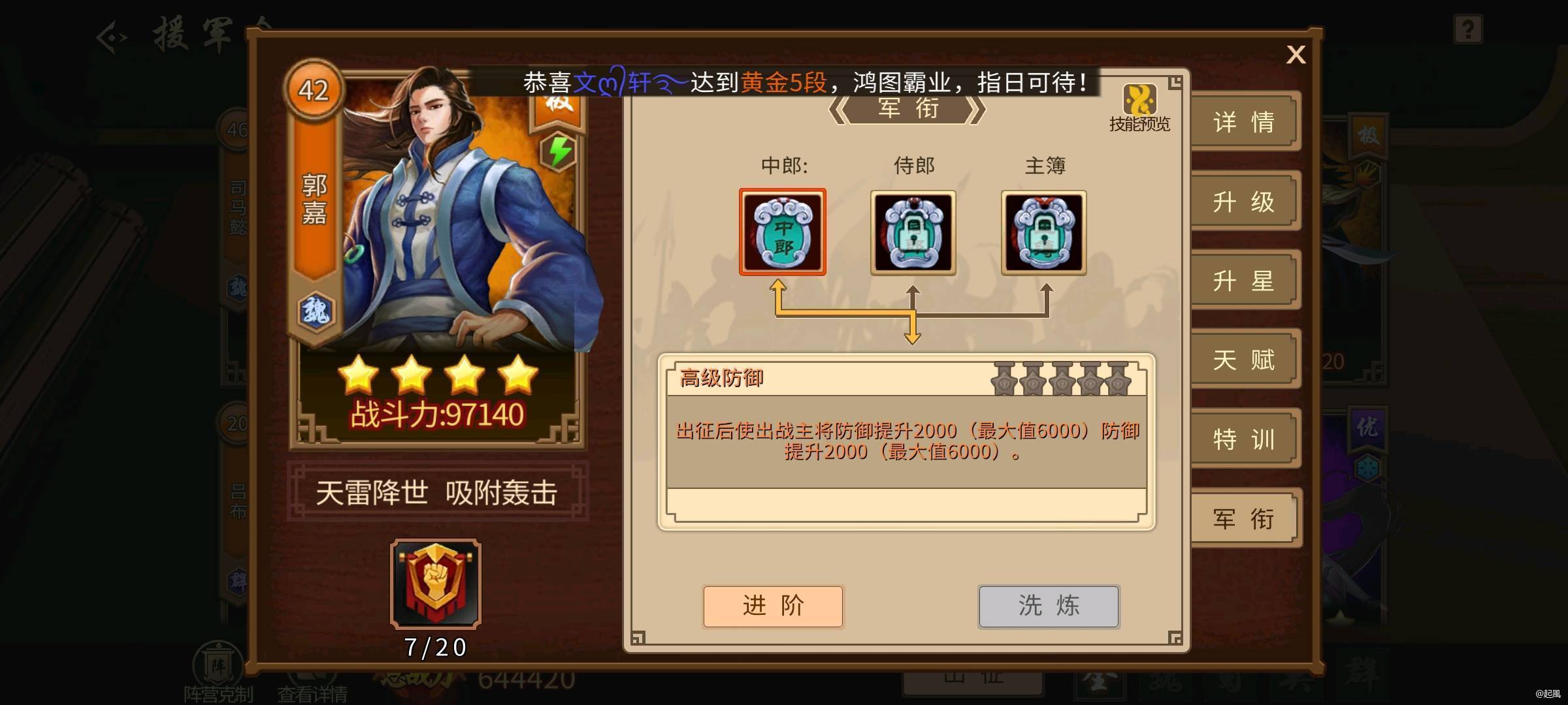 三国战纪各个系统、副本、玩法都逃不开五属性的限制,所以毫无疑问我们需要5个不同属性的援军来作为破盾辅助;其次三个主力慢慢培养等升星以后激活军衔军衔以获得更高战力。