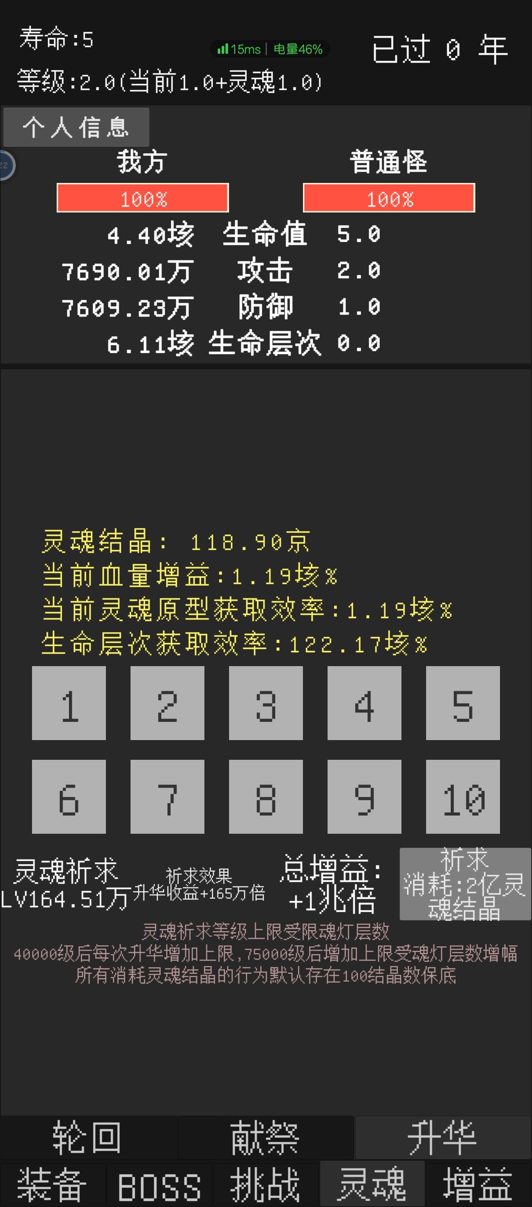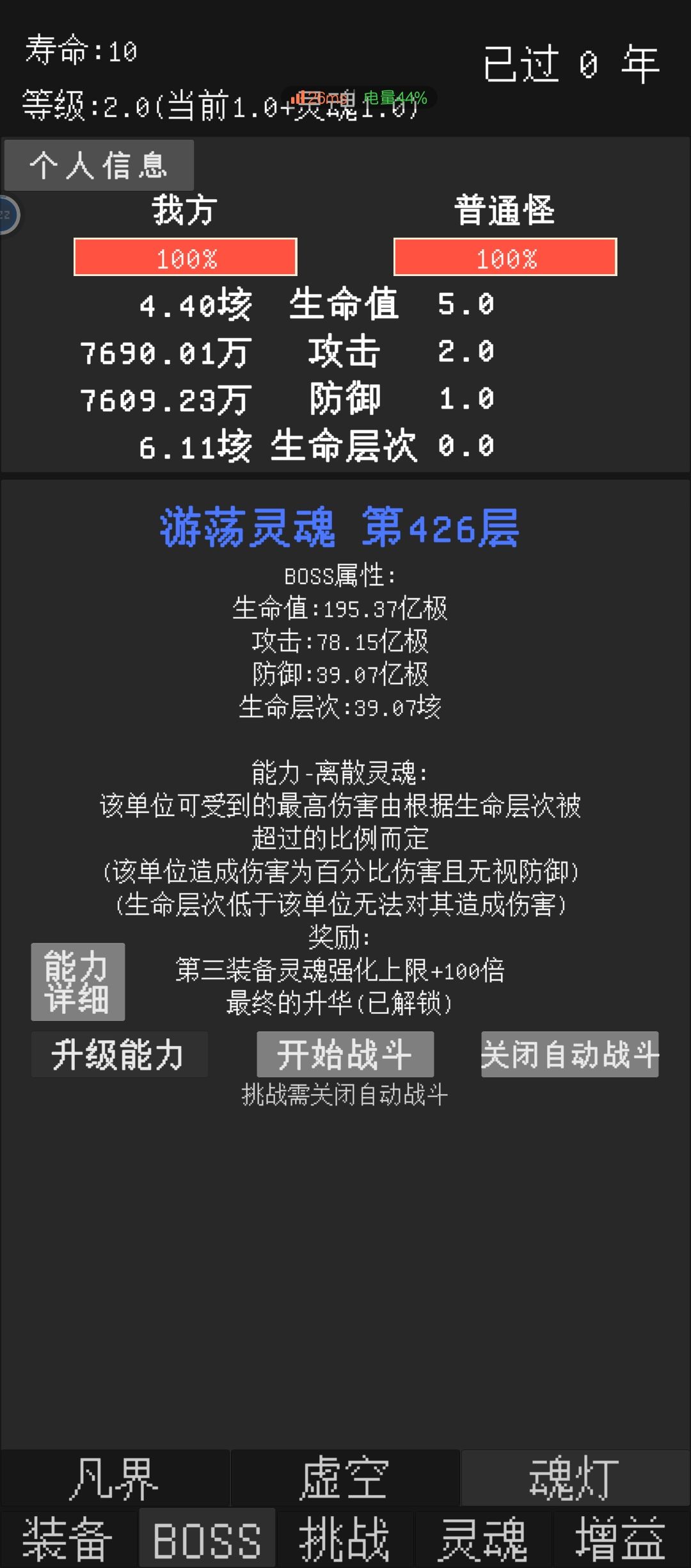 最后说一下魂灯。魂灯根据生命层次不同,能打到的级别也不同。魂灯主要看生命层次,层次不够就一定打不过,不像虚空boss,层次不够你属性翻倍也能打过。刚打过虚空5的话,魂灯最多也就10层。绝对不要考虑打过50层魂灯再升华什么的,因为魂灯升华提供的灵魂结晶加成不是说打过50层就有,而是打过50层,并且用500结晶升级后才有。