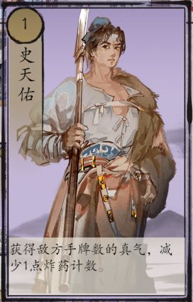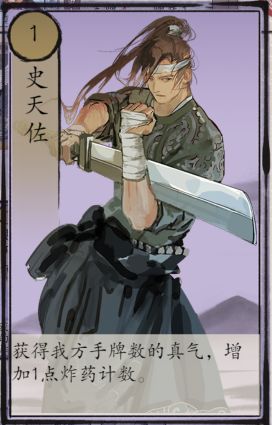 史天佑(史存孝义叔,史家庄二当家):江湖紫卡,百毒不侵:1费,抵抗:获得敌方手牌数的真气,减少1点炸药计数。