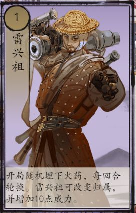雷兴祖(雷海蟾之父,霹雳堂门主):江湖紫卡,狂雷将至:1费,开局随机埋下倒数10回合的火药,每回合轮换归属,计数0时造成10点爆炸普攻。重复使用雷兴祖可轮换归属,并增加10点威力。