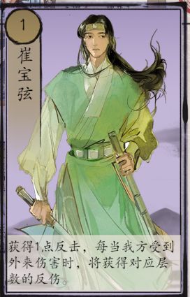 崔宝弦(朝鲜武将,李芳远侍卫):江湖紫卡,花郎腿法,反击:1费,获得1点反击,每当我方受到外来伤害时,将获得对应层数的反伤,效果可持续可叠加。