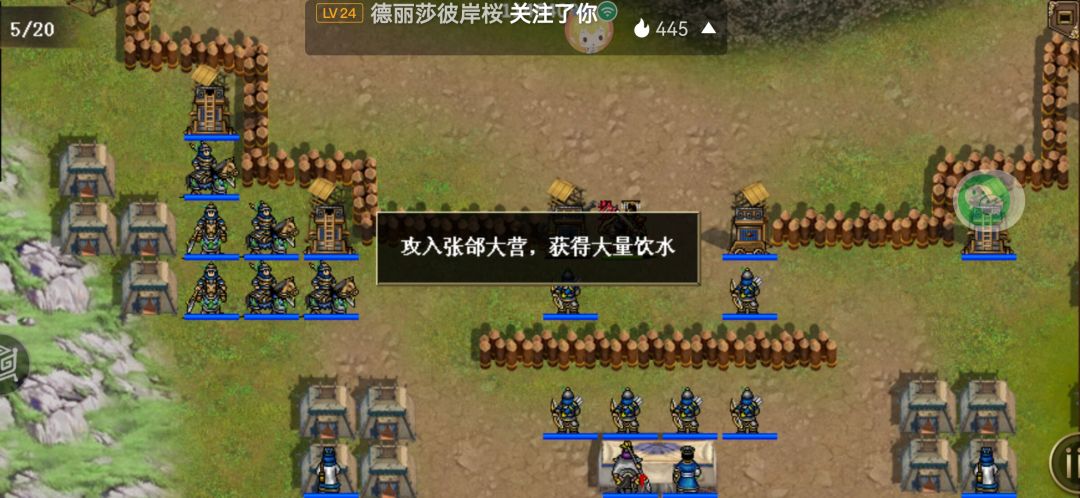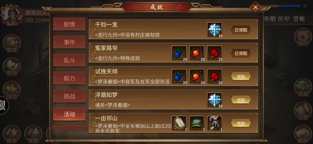 开局剧情被断水,每回合少蓝,蓝没了就会少血。如图三刘备那样可以保护友军(图二,弓箭手也可以在前面杀两个用兵仙追击)马谡尽量不动(就在初始位置)。开局先把右边弓箭手用翼候法正群体暗杀三个,然后剩下的用兵仙刘备追击完,然后兵仙刘备过去保护友军。第二回合就可以把左边的敌军清光,兵仙刘备在图五的位置把右边医师死了可以触发第一波伏兵和王平那堆人,王平那堆人往上走就不会被打到(要走到马谡那儿),下一回合在伏兵上面一点(图六)会触发第二波伏兵,然后在门口(图七)触发取水剧情和第三波伏兵。最后全灭敌军过关完成前三个成就(图八和图九)我是刚出活动关的时候第一次打然后打成图八那样就完成成就了。后面更新了后变成二十五回合(还多了个一线生机的成就),有人就说要在山上呆满二十回合,二十一回合开始下来触发伏兵和剧情,有些人就完成一出祁山了。一线生机我试了好多次,但是不晓得怎么完成。
