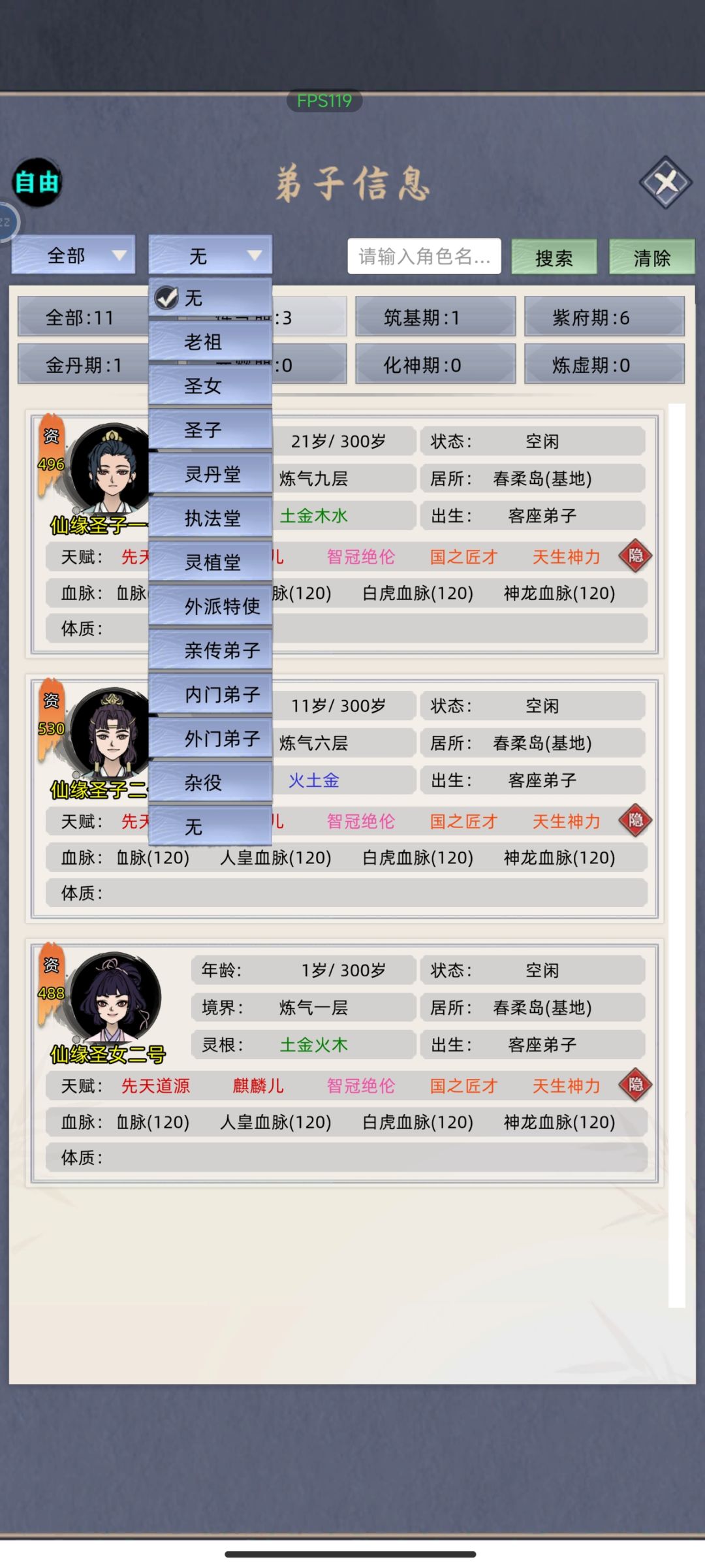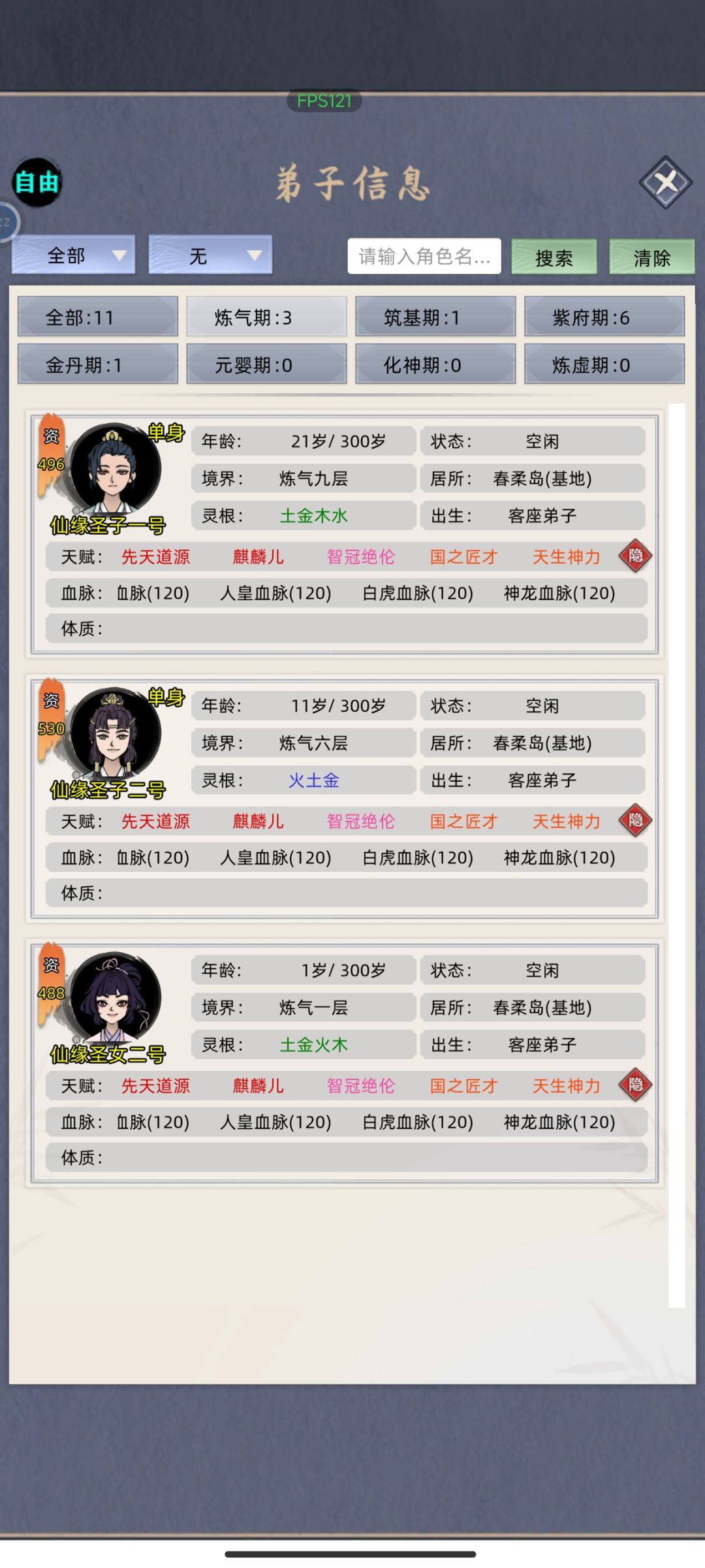 (4)资质生孩子上限在700左右,超过的部分直接不继承了,比如我父亲15条天赋,体质吃的道体丹,资质超过七百了,生孩子天赋加体质会卡在最高刚好七百左右,如果满体质了,则天赋继承不全,从前到后继承,后面的就不继承了(所以某些方面五灵根体质更好,大后期能多继承天赋)