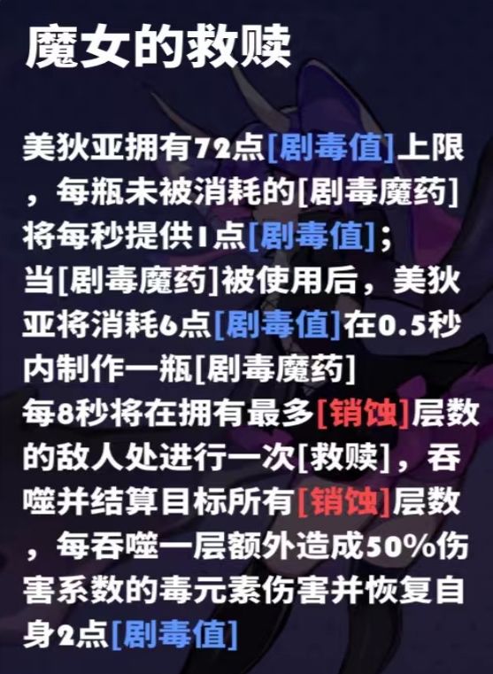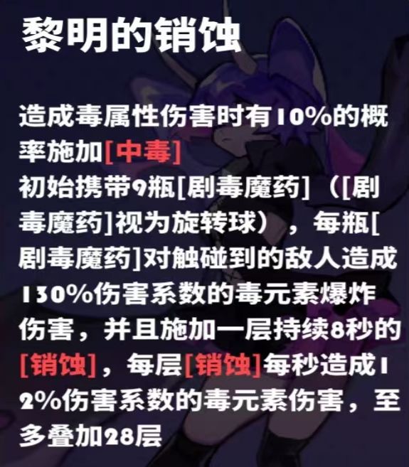 独特机制:剧毒魔药替代旋转球羁绊,初始携带9瓶剧毒魔药,消耗剧毒值可以生成剧毒魔药(6点剧毒为1瓶,且剧毒值上限为72),剧毒魔药具有索敌机制(部分关卡有无伤点位,挂机即可逃课)。造成伤害可以触发销蚀效果(增伤且8秒后会对单个造成一次【救赎】效果)