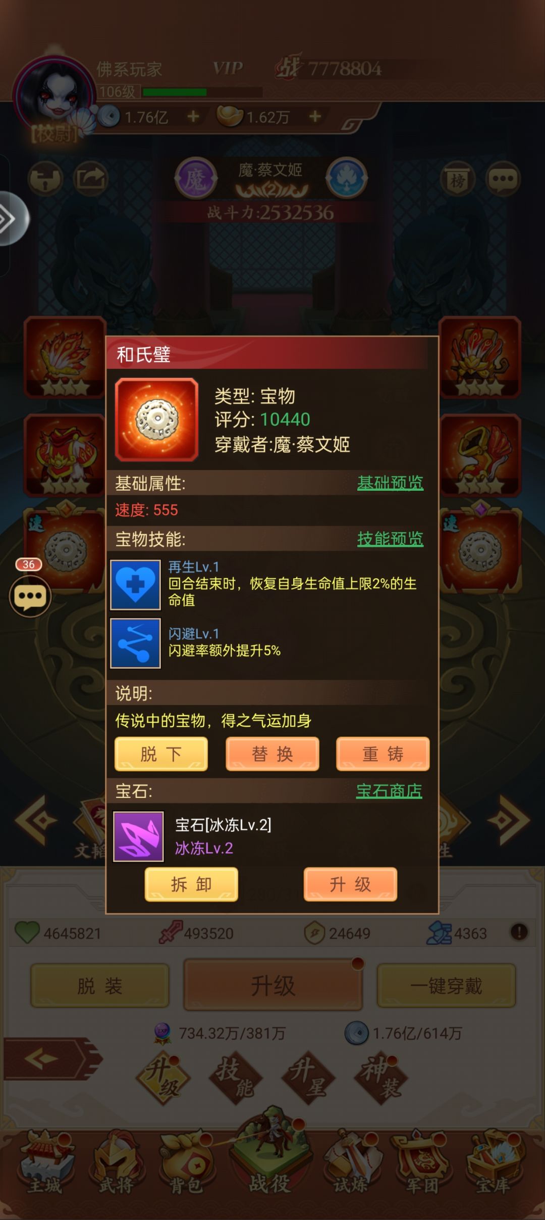 法宝:主C一定要用速度型法宝,不然没机会出手,前期没必要去追求什么技能等级,只要基础的速度属性上去就行了,宝石打速度和冰冻,或者眩晕,其他人全部打控制技能,主坦打防御技能,宝石慢慢来,不急