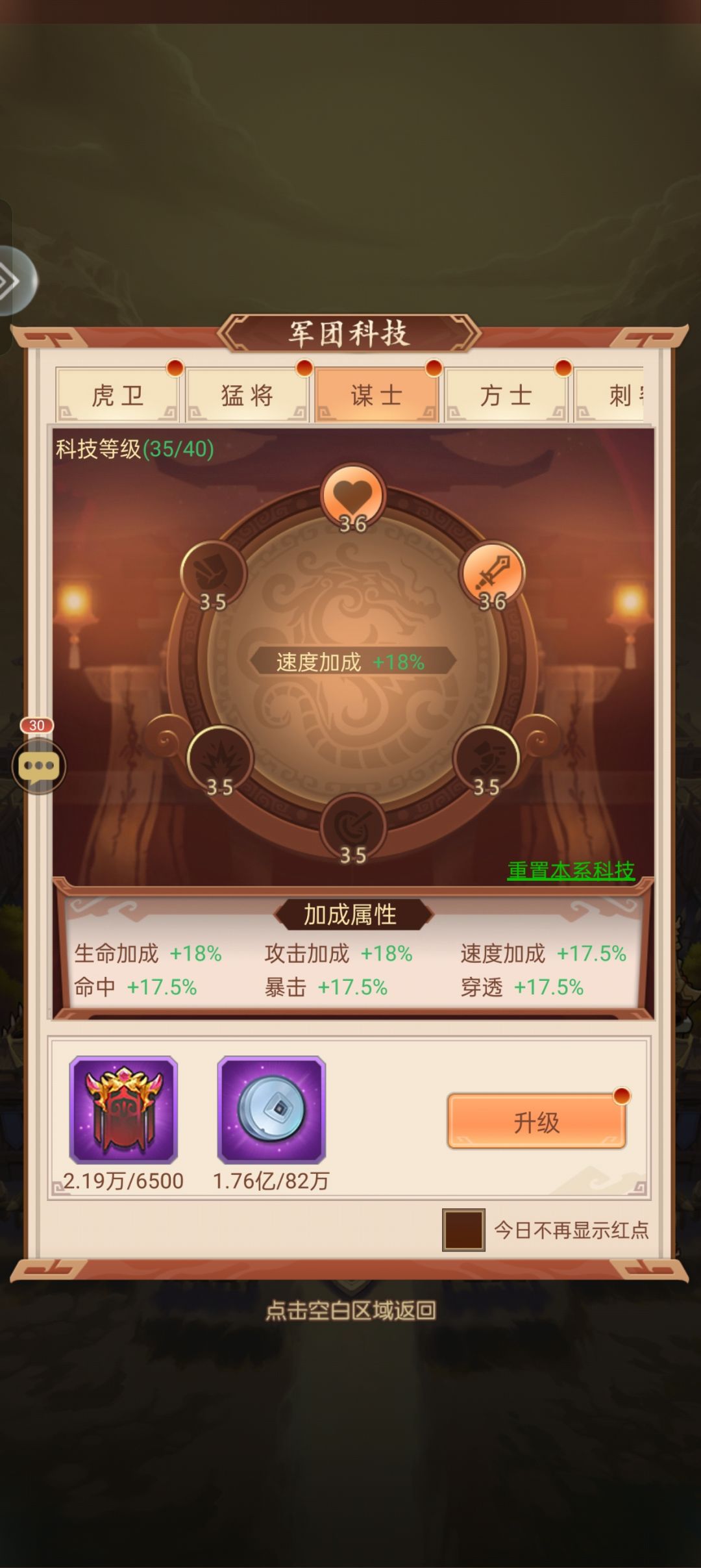 武将养成:全部资源养蔡文姬,到12星开始,可以养一养其他17资质的进攻型武将,类型不要选择太多,因为选的多,你就投入的多,打个比方,你只养猛将和谋士,那么你军团科技所有资源只需要点这两个类型,虎卫确实比其他职业抗揍,但我不选择养,因为虎卫多了没用,因为一个虎卫点科技,又浪费资源,我点科技之后,猛将不比虎卫差多少