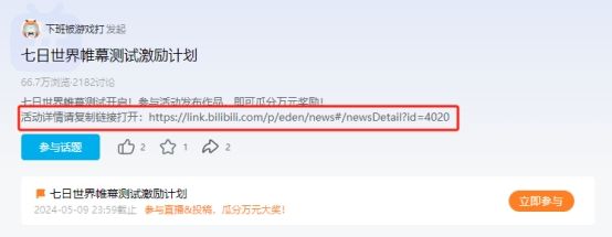 进入B站首页,搜索“七日世界”,点击“七日世界帷幕测试激励计划”中的查看详情,根据页面上方的提示,复制并打开链接即可查看活动详情。