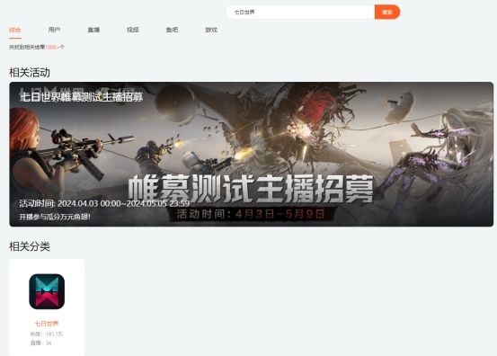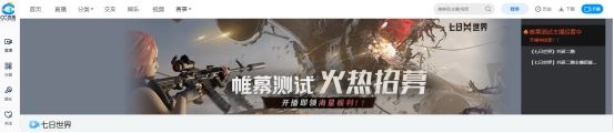 进入CC直播首页搜索“七日世界”,在“相关分类”一栏中进入专题页面,在网页顶部的滚动横幅中点击“帷幕测试主播招募”图片即可了解活动详情。