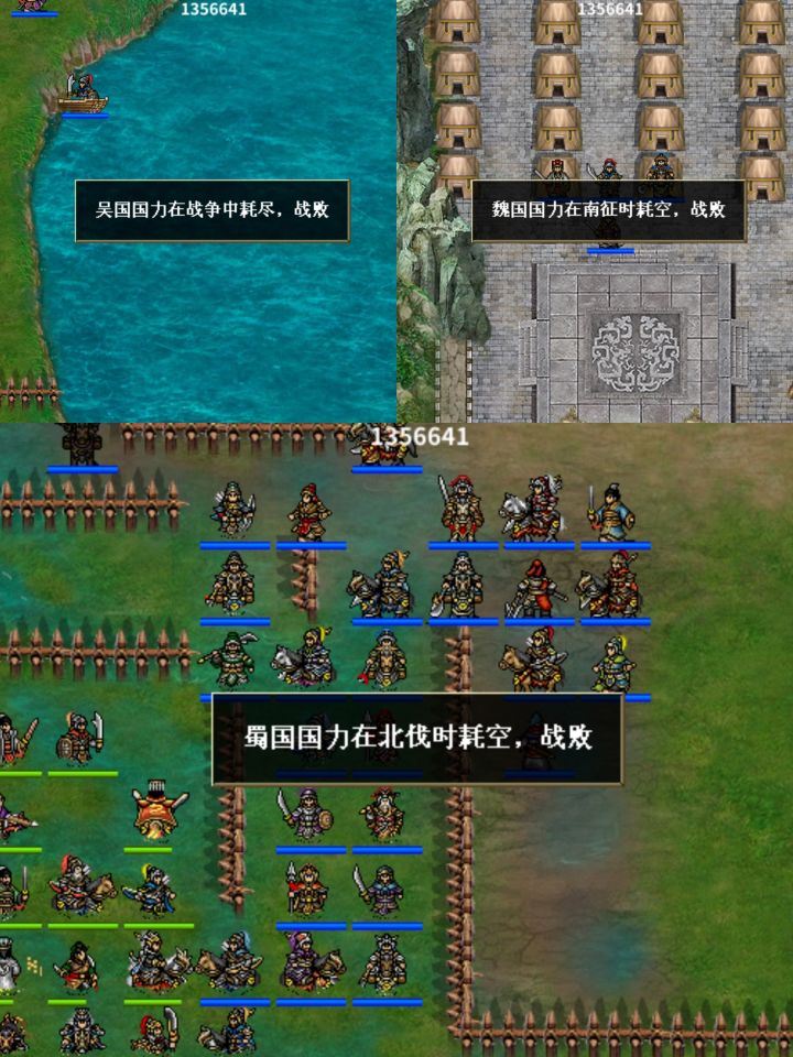 ④注意回合存档!!!物理主力堵自己家门,关羽在家里和孙乾以及孙子兵法队友回归劈敌人,剩余人物冲出去送人头(减弱自己国力很重要)。如图3,收割魏吴人头直至魏吴国力都为1,于第40回合前提前消灭西北方向戍边骑兵(会给我方带来各种加成),提前放出乌桓骑兵。保持魏吴国力为1,让魏吴和乌桓骑兵击败蜀国(主力吃转生丹加快国力消耗速度),完成“自毁长城”。读取存档,消灭魏或者吴,完成“兴复汉室”。