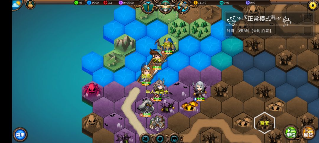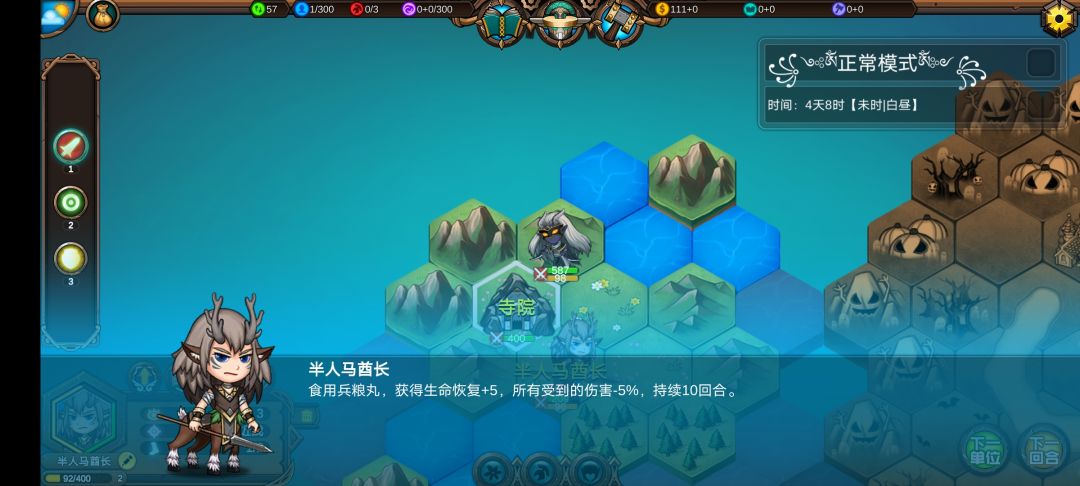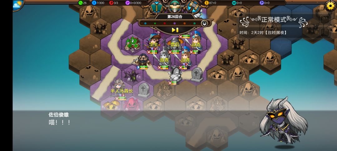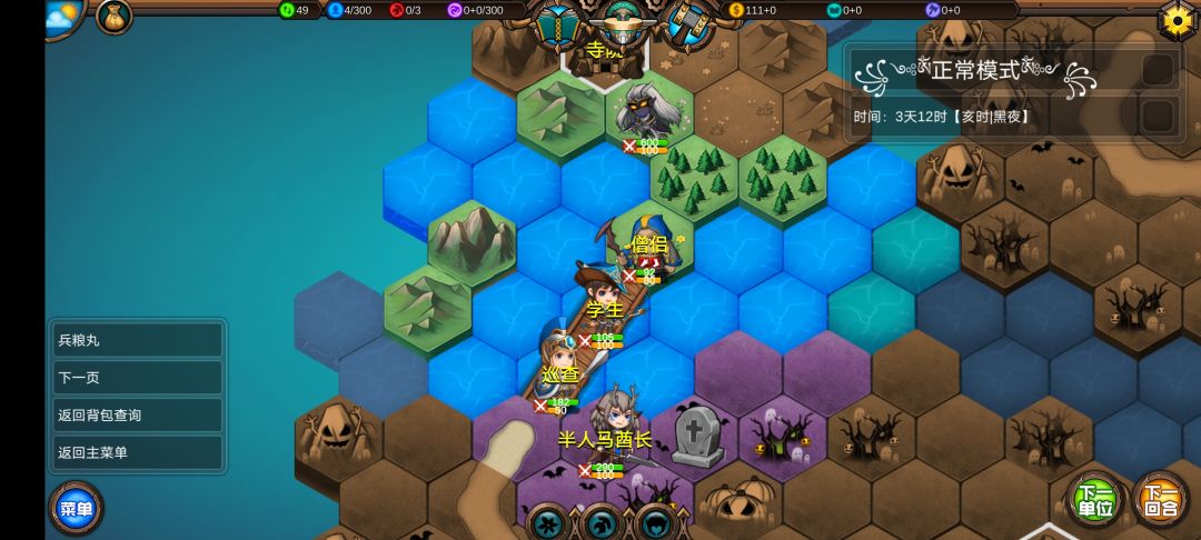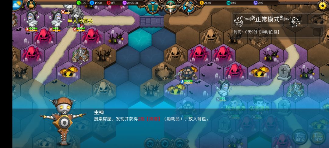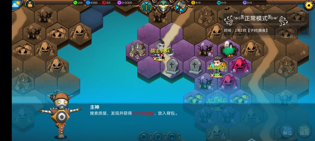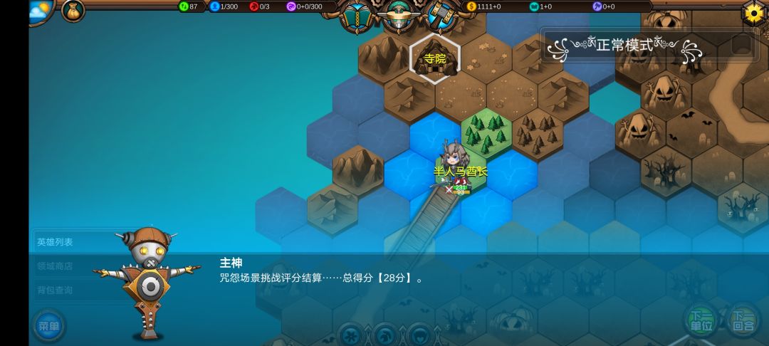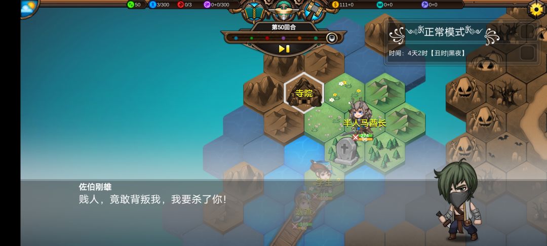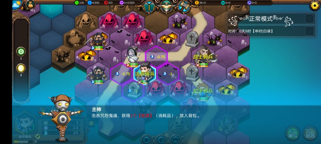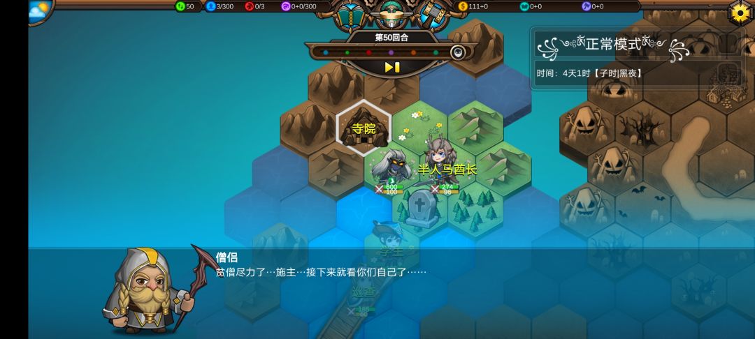 仅有的一点潜能学了个技能,仅有的1100多积分雇佣了3个不同的佣兵,还剩100多积分,10回合咒怨连寺院都到不了,哎!