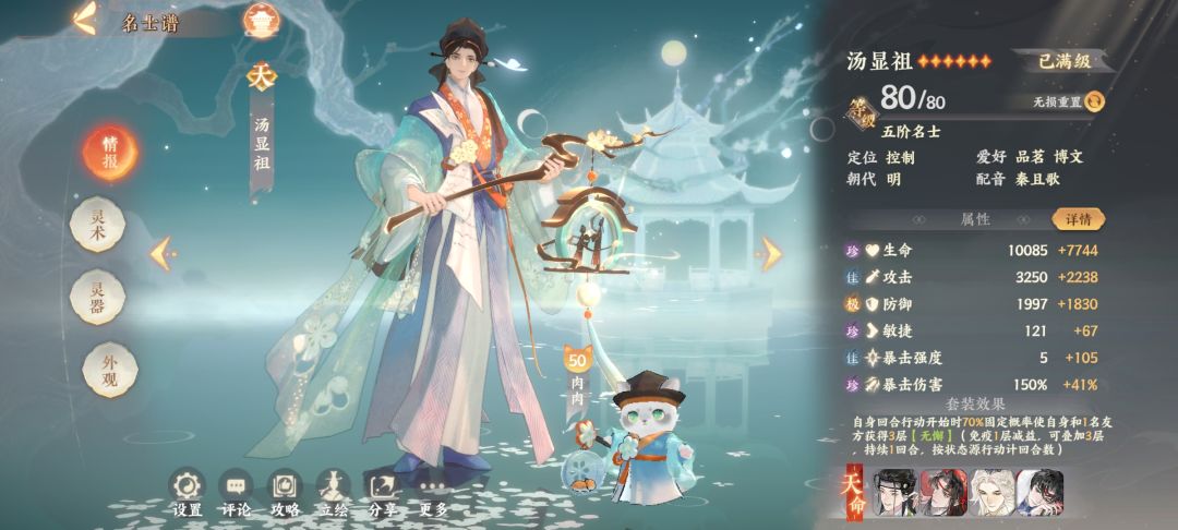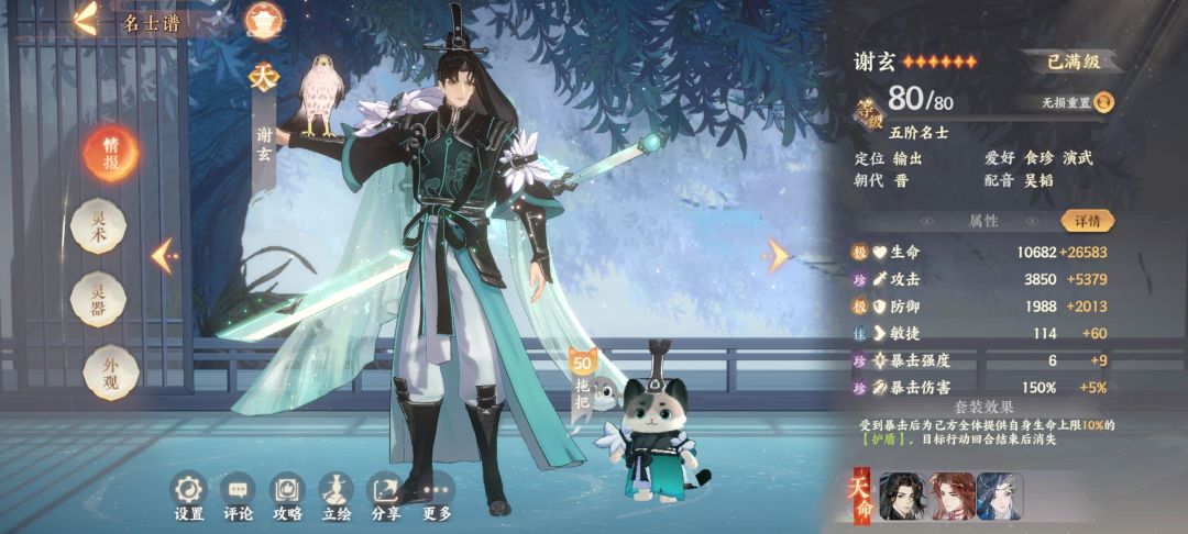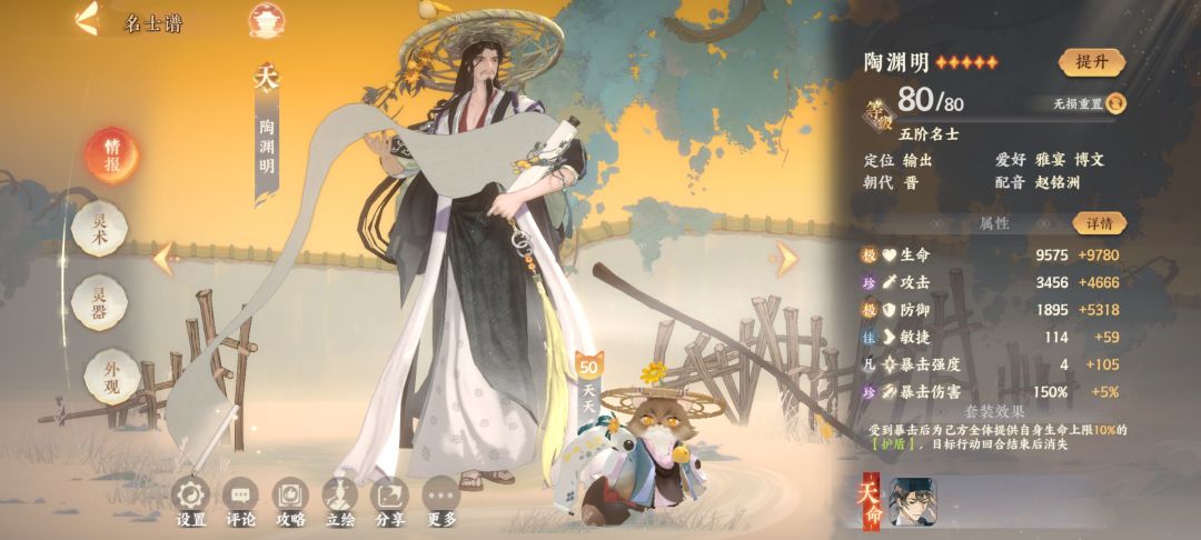 面板如图,陶渊明差1星满。940玄奘、汤祖没有专属且不满。陶渊明穿了防御承佑,谢玄穿了生命承佑,玄奘和汤祖一个是生命长振一个是防御长振。猫的属性也是常规要求的属性。