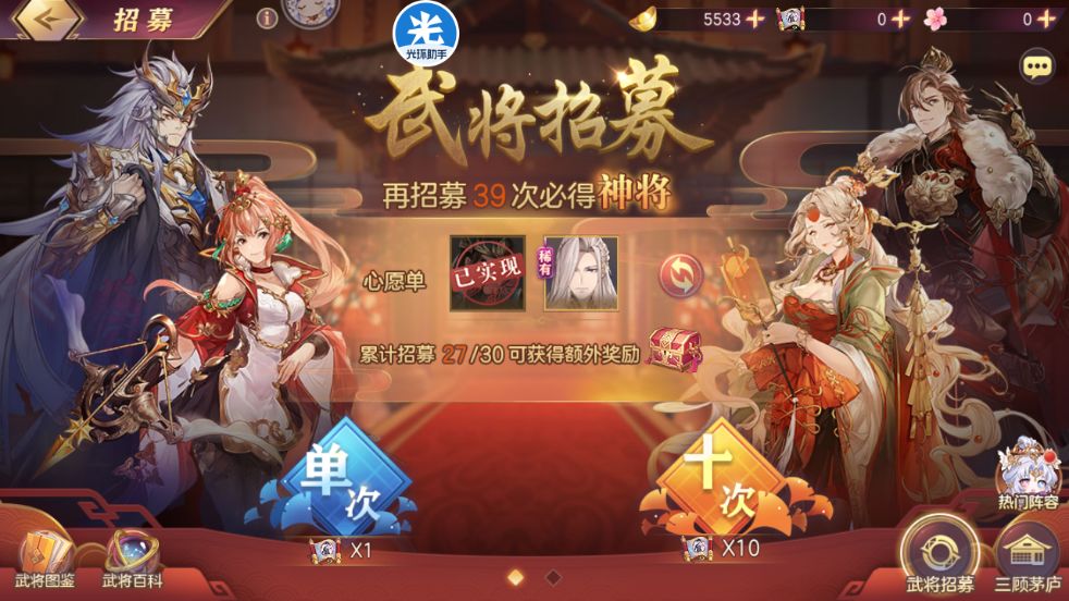 今天拿到了魂张飞,看招募能不能出来关羽,歪了就用碎片兑换。出来了一个关羽。心愿出来就好,切记不要上头。