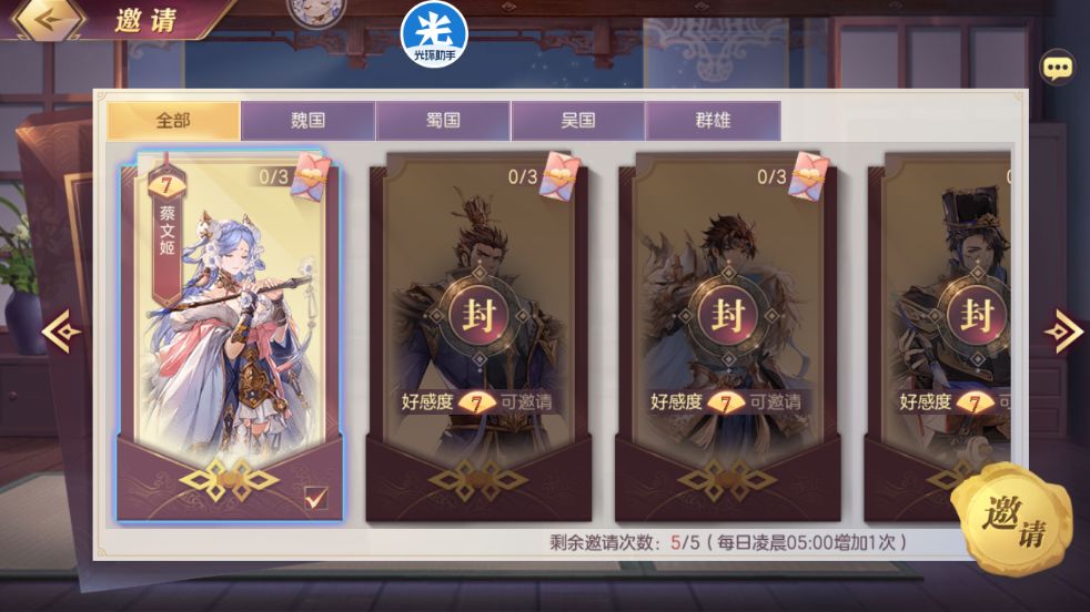 家园好感度可以优先把蔡文姬培养到7级,然后出游。