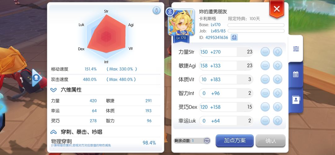 -属性点就敏捷凑300即可,其他加力量就行,我加了DEX是为了偶尔打架凑命中用,提示一下卡卡攻击吃命中,进竞技场请保持1000命中以上;