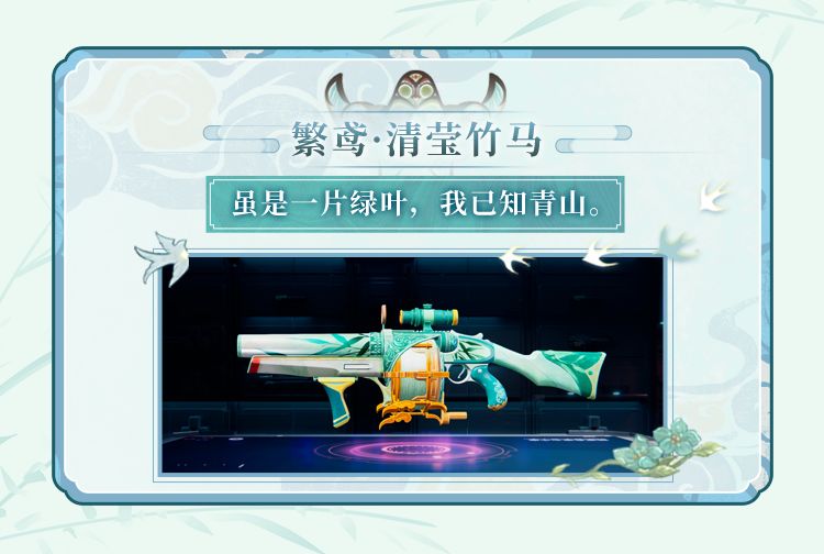 全新G2-红角鸮武器皮肤「繁鸢·清莹竹马」通身青碧,青草繁生,在设计上还增加了独特的纸鸢纺锤。