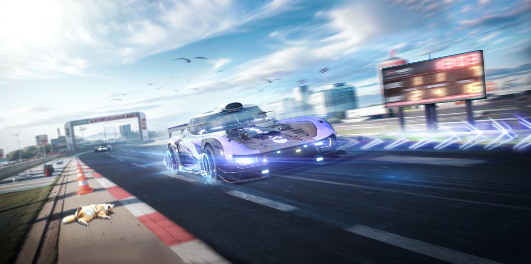 全新改装双人跑车「紫荧流星」流线型的车身优雅有力,跑动过程中荧紫涂装犹如空中一道流星飞过。