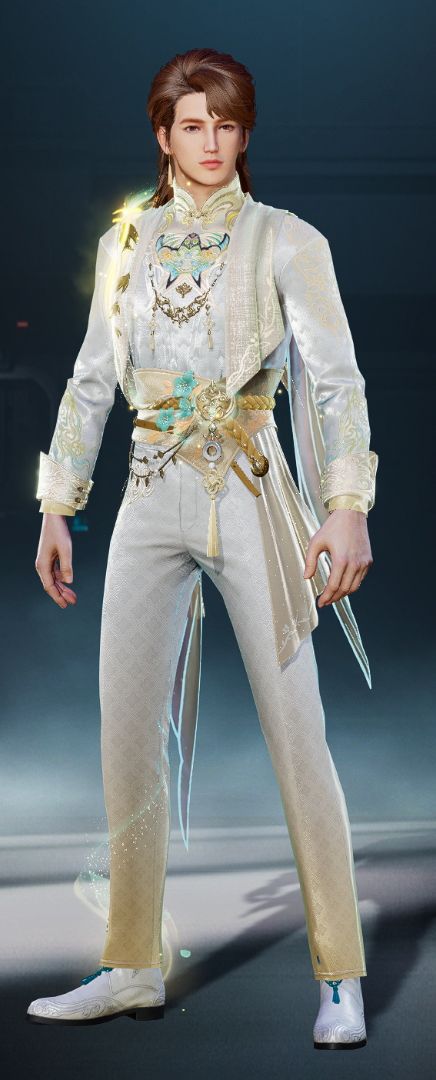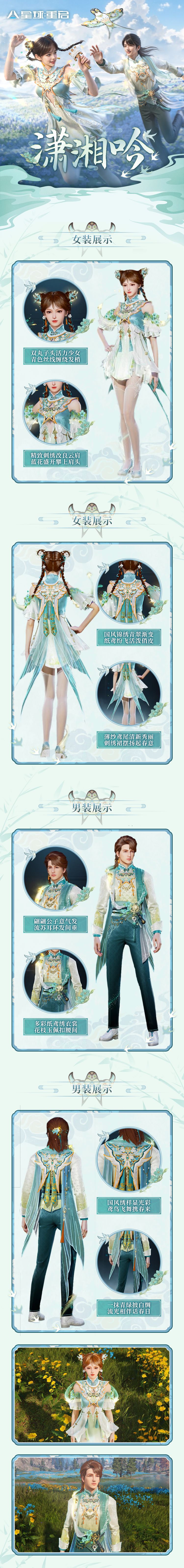 潇湘碧水等君来。「潇湘吟」踏青时装包含头部、整装和鞋子共三个部位,青绿色小纱裙搭配上可爱的双丸子头,将女款衬托得更为俏皮灵动,男款则气质内敛沉稳,翩翩公子等候佳人。