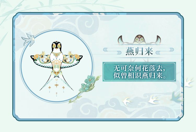 纸鸢纷飞主题背包「燕归来」即将上线。该背包为造型独特的燕子纸鸢,精致刺绣翡翠玉坠光芒闪烁。在佩戴过程中,背包上会有蝶舞翩跹的效果哦~