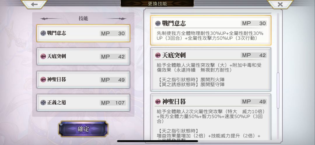 前排【天】角色3人以上时,自身力量智力100up+心技一体赋予