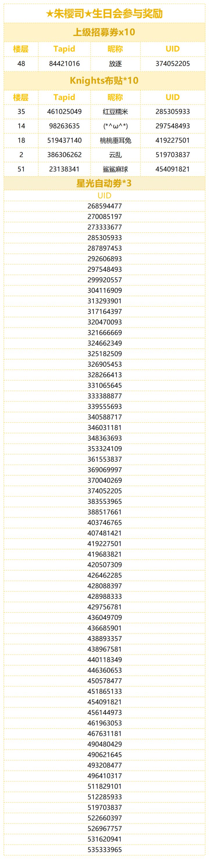制作人们久等啦,让我们恭喜以下幸运的制作人们!助理君已统计全部正常显示楼层与图片,奖励会在7个工作日内发放到制作人的礼物盒中,请注意查收~!今天是朱樱司的生日!让我们一起带着关于司的可爱表情包们,大声说出happy birthday~(◍˃̶ᗜ˂̶◍)✩即日起~4月7日23:59,快来分享关于司的各种可爱表情包吧~!不要忘记附上正确的UID哦!毛豆豆会摸1位制作人送出上级招募劵*10、再