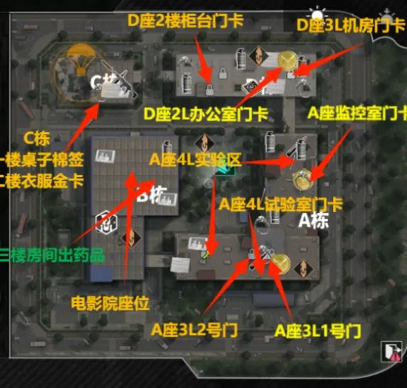 三楼和四楼有较多的小金刷新位置,各位可以去主楼的楼顶大圆盘上,可以观察到医药公司基本所有的信息,因为楼层比较多,在室内作战时如果有敌人我们可以使用冲锋枪。多使用毒气弹来获取敌方的具体位置。