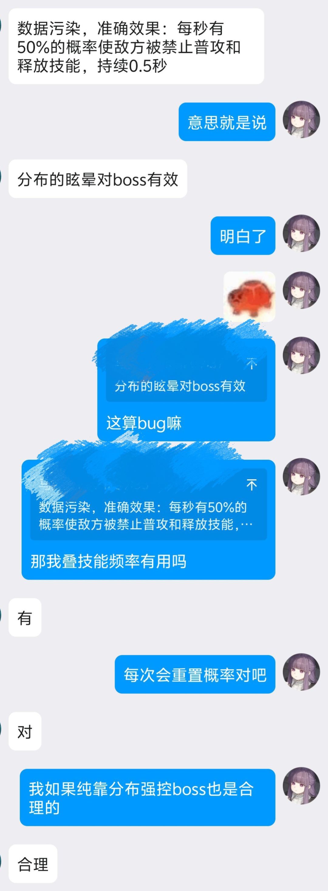 在上述完以上内容后,我们得出的结论即为:【数据污染】会有概率产生沉默效果,该效果会导致BOSS的技能前置条件异常,也就导致了后续的技能不能触发。
