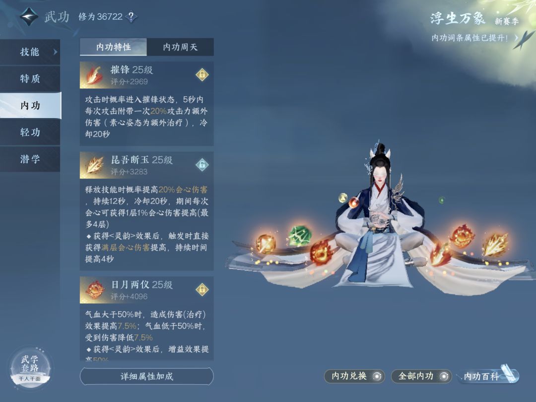 内功方面,金昆吾断玉可以替换掉破釜或者鸣干戈,火昆吾可以替换掉众秒或者点名炉,内功词条现在全元素攻击>破防>攻击,气海,身法,会心,命中>首领克制,单元素攻击,大小攻击