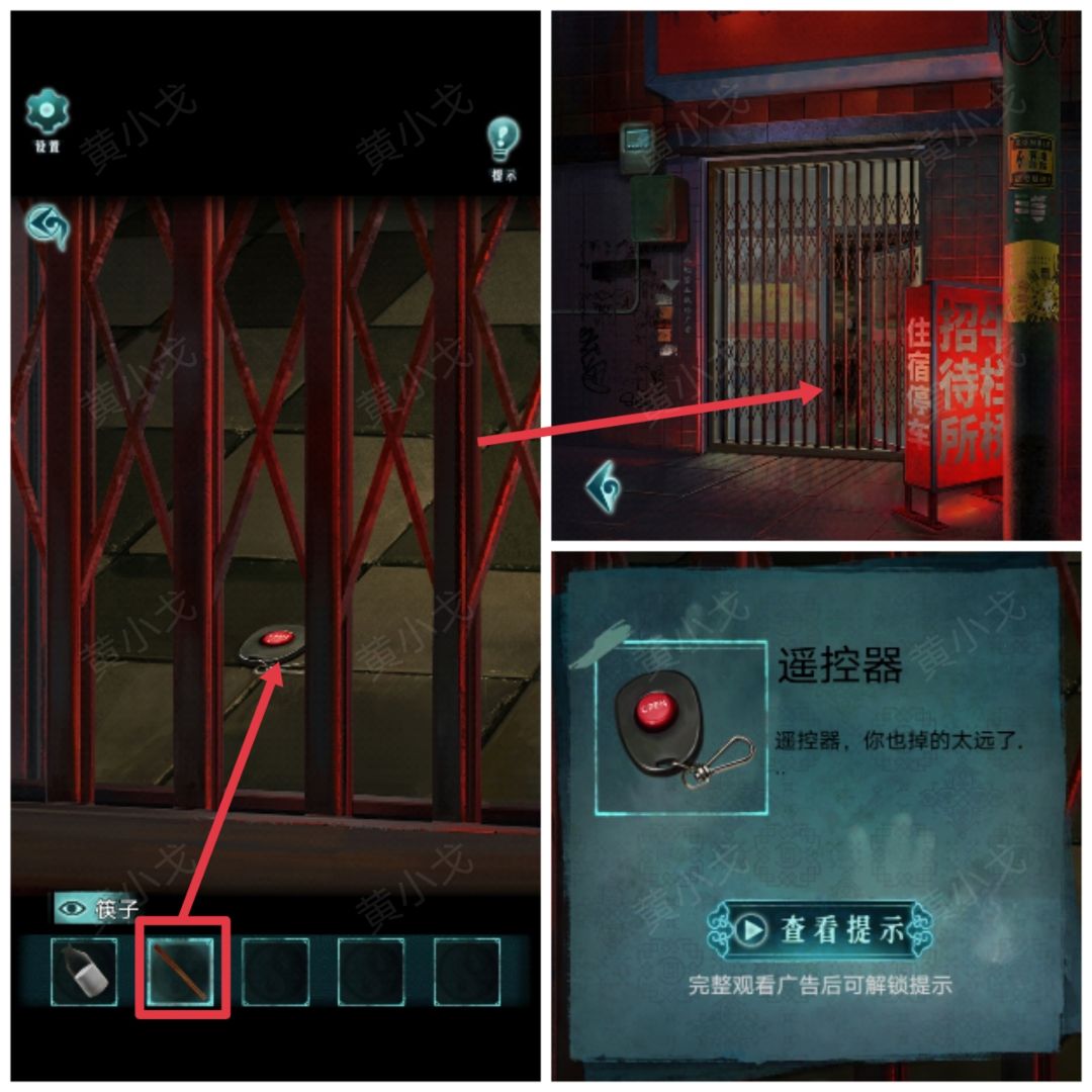 22.(招待所外)点击铁门,用【筷子】夹门里面的【遥控器】