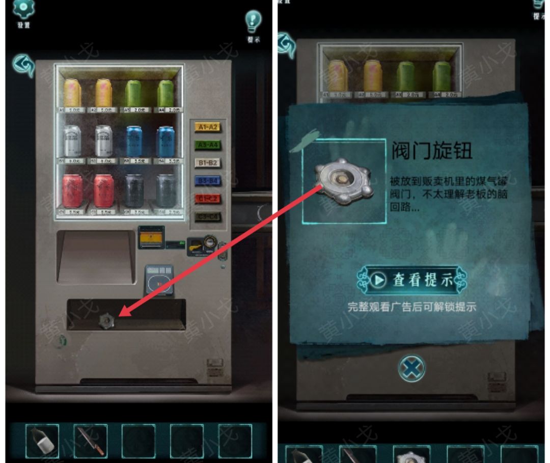13.(小炒店外)点击自动贩卖机,根据贴在墙上的广告,按(白橙红橙白)的顺序点击对应颜色的按钮
