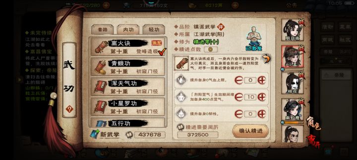 精进1是15血,精进2是400罡气,秘技五禽戏是10血,通合妙法是6防,3回血,250罡气,这么对比一下,离火诀的精进2数值给低了😡