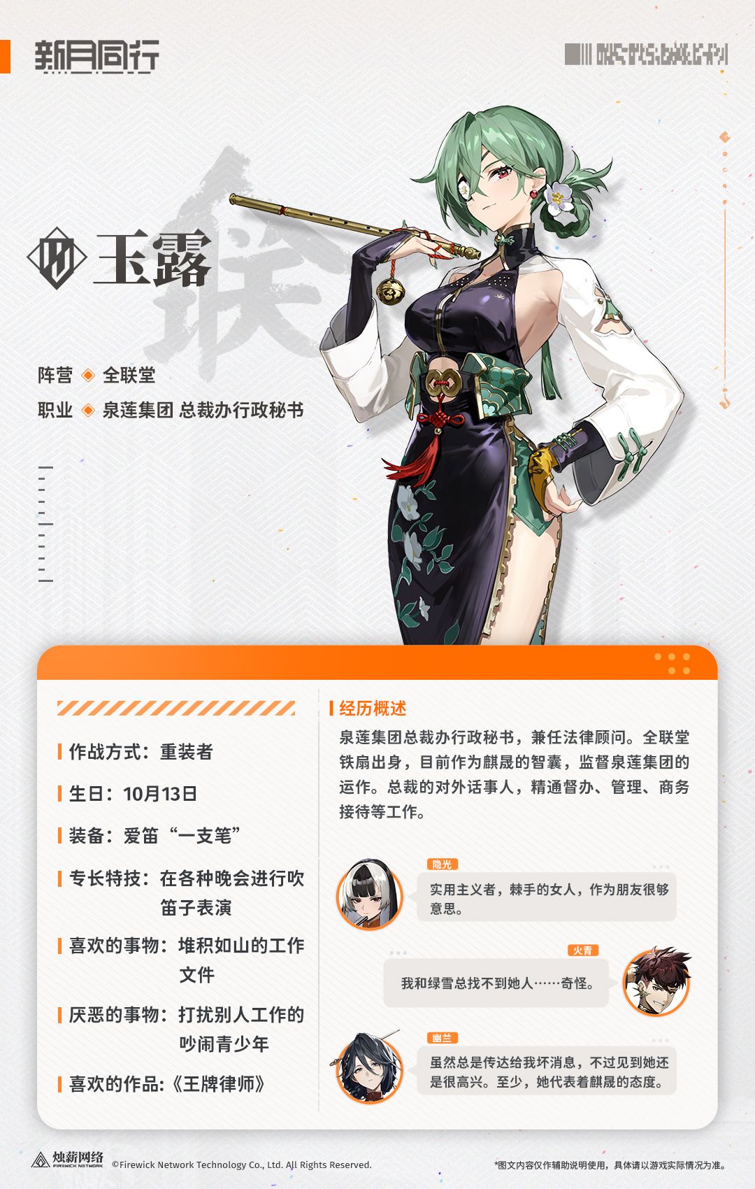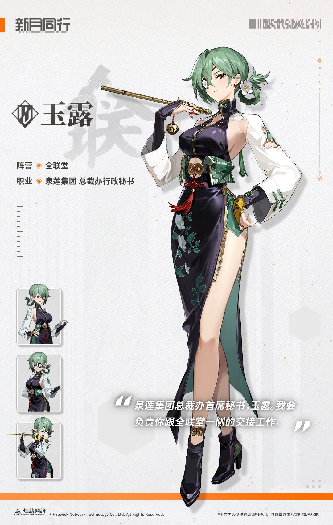 全联堂铁扇出身,目前作为麒晟的智囊,监督泉莲集团的运作。总裁的对外话事人,精通督办、管理、商务接待等工作。