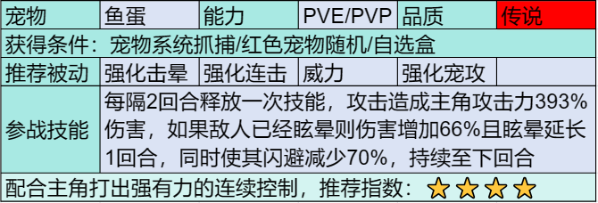 PVP与PVE能力极强的宠物,可以降低敌方的闪避,抵抗击晕,以及防御值,甚至还能造成缴械效果,在PVP与PVE中起到了极好的作用,是一只全能型宠物,不仅能打输出还能打控制还能造成负面效果,非常优秀的一只宠物,非常值得培养
