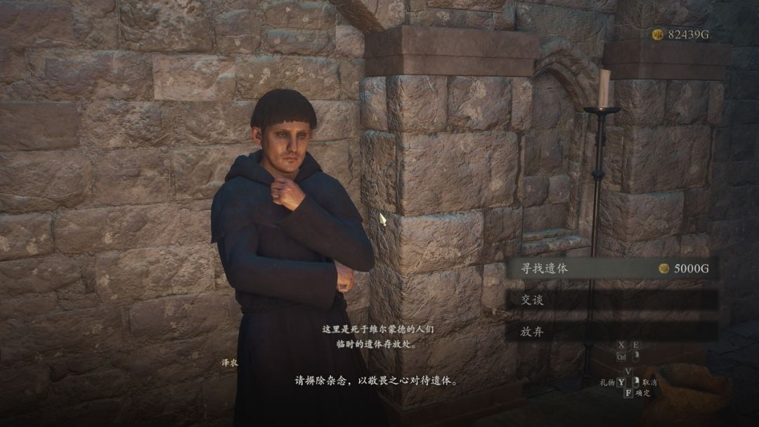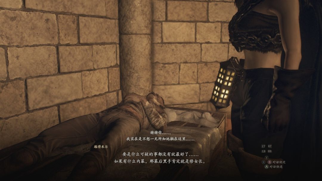 我开始变得郁郁寡欢,不断抚平着自己愤怒的情绪,这肯定是卡普空精心设计的弱引导关卡,一定有我未曾发现的环境线索。是的,我在一个任务结尾上磕磕绊绊了将近两个时辰,直到游戏即将来到第二个夜晚,我才终于是怒不可遏,准备直截了当的实施结果正义,由于我颤抖的手指按错了键位,卡普空给我开了个巨大的玩笑,我竟然阴差阳错的完成了任务!游戏里有一个抱起的动作交互,在此之前教程里只草草提到这一交互可以用于地形投掷与敌人恐吓,所以我压根没想到能运用到日常任务里,原来“抓捕修女”是物理意义的逮捕修女,我瞬间哭笑不得,佩服的五体投地,