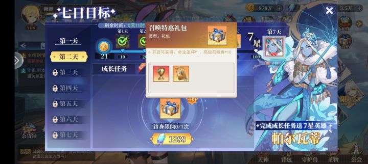 七天任务中,每天都有优惠成长礼包,比直接购买抽卡卷优惠很多。