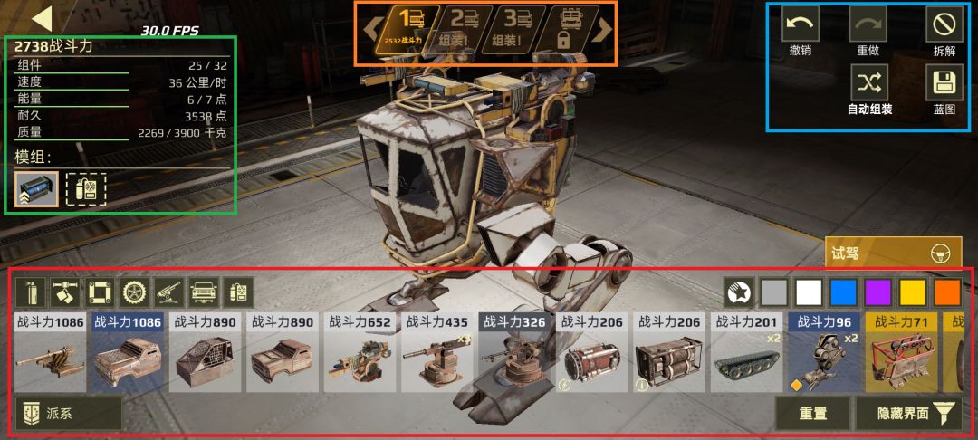 战车装配器的界面主要分为4个部分:左上方绿色部分是战车详情信息,正上方橙色部分是车库蓝图,下方红色部分属于部件选择区,右上方的蓝色部分则是功能区。